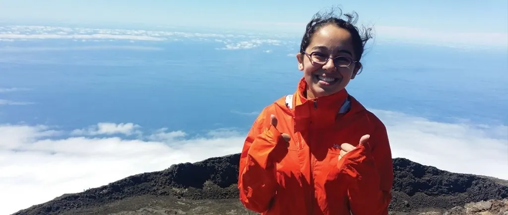 キアラは、ピコ山に初めて登頂したときの気持ちを振り返りました。彼女はまるでその光景を絵に描いているような手振りで生き生きと話しました。