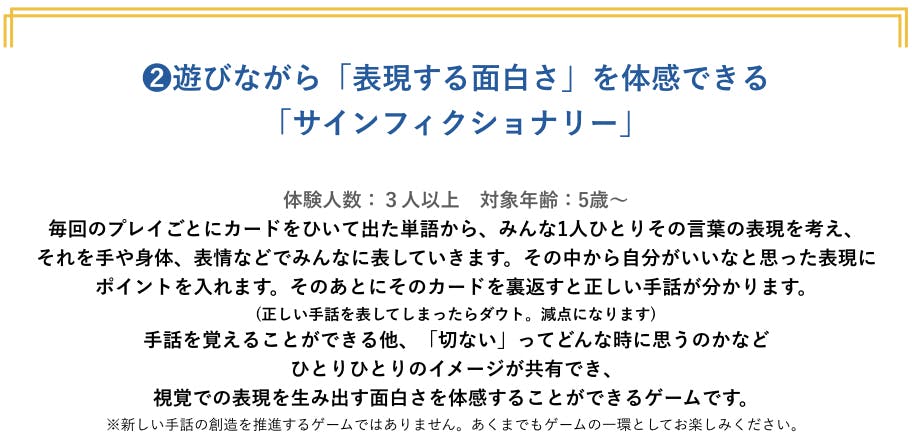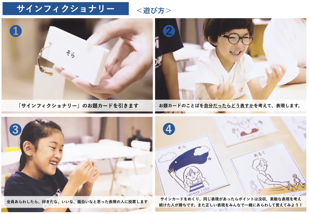 私たちが実現したいのは、言語の面白さを知り、伝え合うことの大切さを体験できる場を作ることです。違いを楽しむためには、まず、音声言語、視覚言語、それぞれの言語の面白さを知り、体感することが重要だと私たちは考えています。
