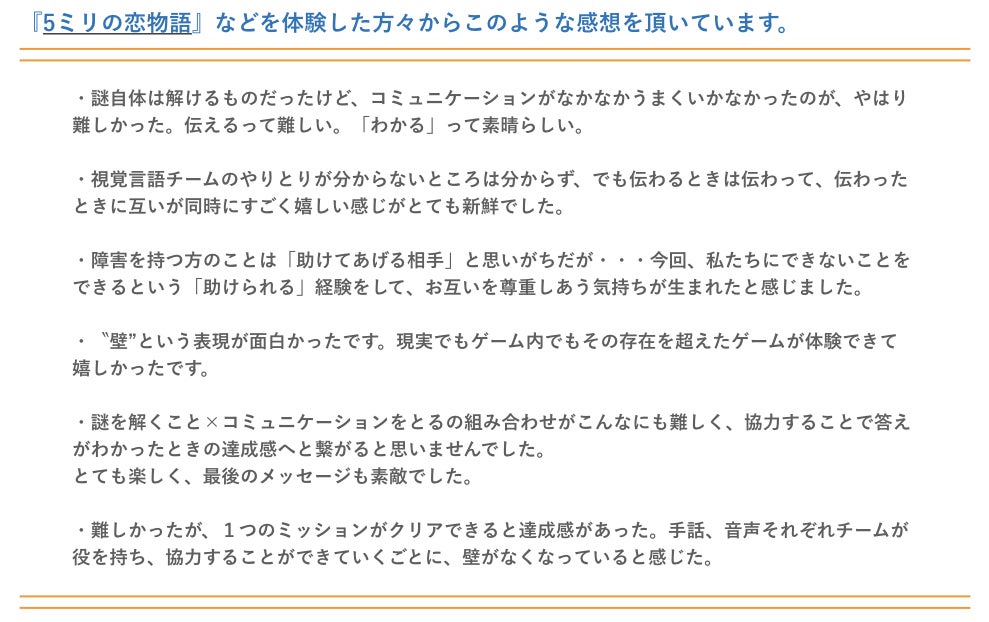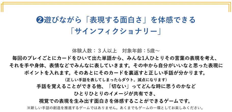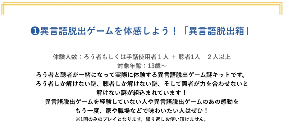 体験型エンターテインメントとして人気の高い「謎解きゲーム」に、手話や筆談、身振り、音声などを応用し、聴者とろう者・難聴者が協力し合い謎を解いていくエンターテイメントです。