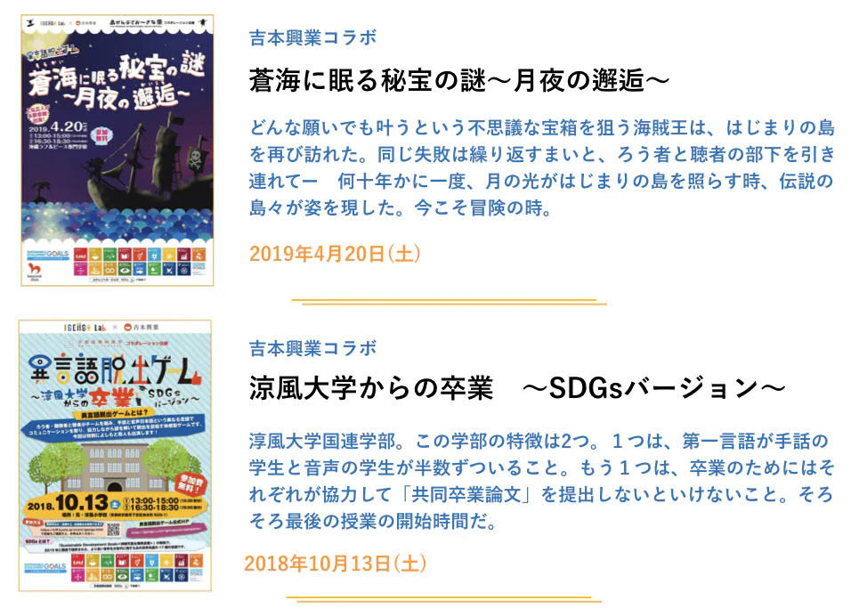 2015年にこのゲームを発案して以降、企業内研修や学校、福祉施設で『うしなわれたこころさがし』等の公演を続け、2018年9月に初の一般公開作品として『5ミリの恋物語』を提供しました。そして、同年10月13日には京都国際映画祭において吉本興業株式会社様とのコラボレーションとして『淳風大学からの卒業~SDGsバージョン』を、翌年4月20日の沖縄国際映画祭では『蒼海に眠る秘宝の謎~月夜の邂逅~』を実施しました。