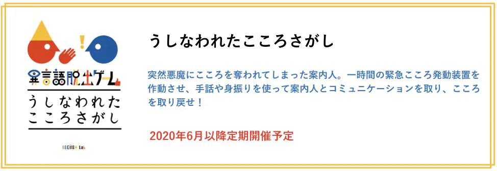 皆様にお届けする異言語脱出ゲーム は『うしなわれたこころさがし』です。手話未経験の方を対象とし、1グループごとにろう者のアテンドが入ります。また、小学生から参加可能ですので、ご家族で楽しんでいただけるコンテンツになっています。