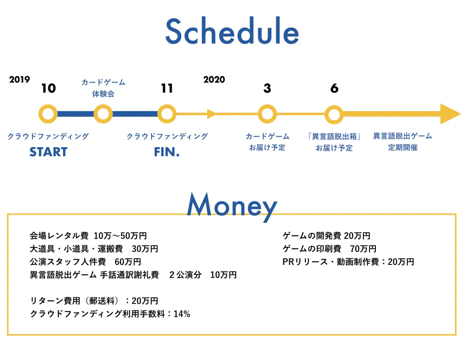 異言語脱出ゲームを作るには、人件費や会場費、内装費用などの準備資金が必要です。このプロジェクトを通して、さまざまな場所で活用できるコンテンツを多くの方に届けることで、手話の魅力、言語の面白さを知り、伝え合うことの大切さを体感する機会を作り出せたらと願っています。