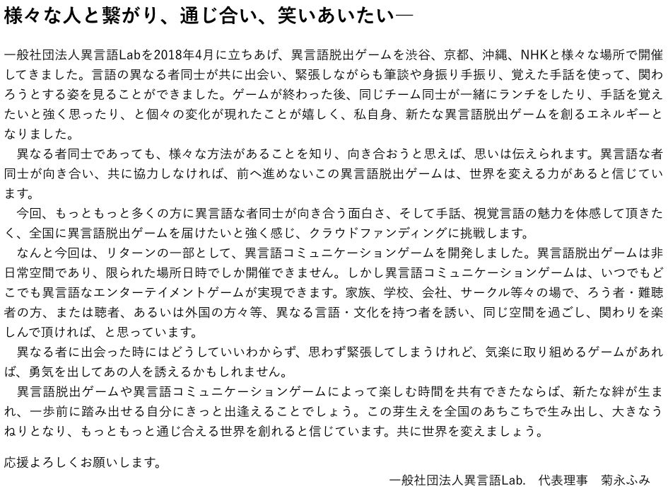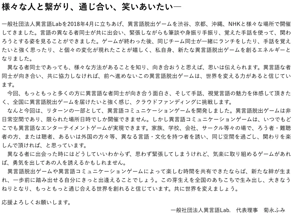 2019/11/29 09:31皆様の応援、拡散のお陰で100万円突破いたしました。目標金額300万円には遠いですが、それでも喜びは大きく、ありがたく思います。異言語脱出ゲームを世の中に広めたい!という願いのもと、2018年4月に一般社団法人異言語Lab.を立ち上げました。未熟で手探りの状態で始め、たくさんの方々にアドバイスとご支援をいただきながら、何とかやってきている組織です。異言語脱出ゲームは、福祉や障がいの類を超え、エンターテイメントとして楽しんでいただける可能性、また手話と音声言語に限らず、視覚障がい、方言、外国語などのIGENGO脱出ゲームへと展開していける可能性があります。ろう者、難聴者、聴者、外国人、誰もが持つ力を、コミュニケーションの壁無く、最大限に自分らしく活かせる社会に、異なる言語・文化を持つもの同士が向き合うことの面白さ、通じ合う喜びが広がる社会に。あと1日のクラウドファンディングです。https://camp-fire.jp/projects/view/201002どうか皆様応援よろしくお願いします。一般社団法人異言語Lab.代表理事 菊永ふみ もっと見る