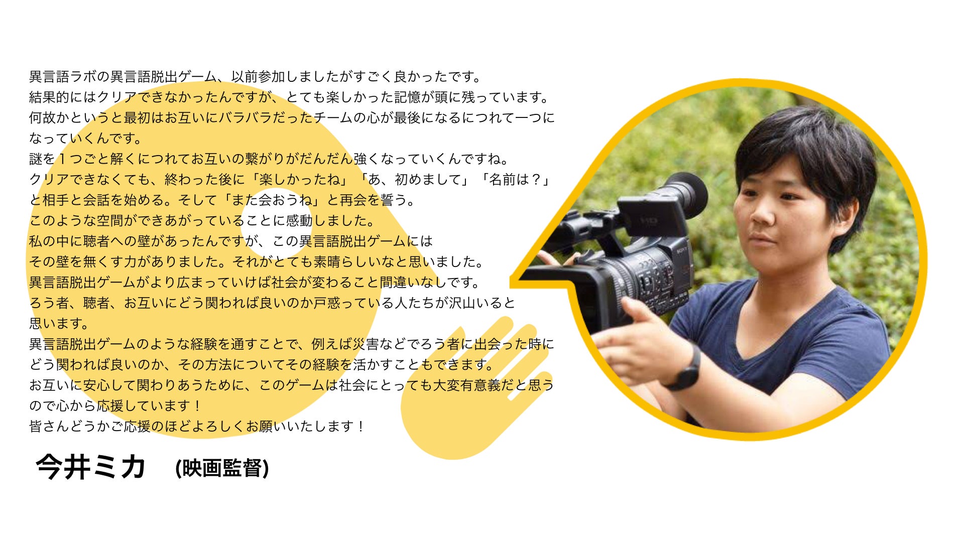 2019/11/28 07:00先日支援いただいた方々、ありがとうございます!大変励みになります。クラウドファンディング挑戦にあたって、引き続いて今井ミカさんより応援メッセージを頂きました!今井ミカさんは今、劇場で上映されている話題作『虹色の朝が来るまで』の映画監督であり、ろう者と日本手話によるろう者の第一言語である日本手話で行う映像・映画制作プロダクション「JSL TIME」の設立者です。異言語Lab.では異言語脱出ゲーム『5ミリの恋物語』にご参加いただき、宣伝協力をいただきました!今井さんからのメッセージどうぞご覧ください。*******************************************異言語ラボの異言語脱出ゲーム、以前参加しましたがすごく良かったです。結果的にはクリアできなかったんですが、とても楽しかった記憶が頭に残っています。何故かというと最初はお互いにバラバラだったチームの心が最後になるにつれて一つになっていくんです。謎を1つごと解くにつれてお互いの繋がりがだんだん強くなっていくんですね。クリアできなくても、終わった後に「楽しかったね」「あ、初めまして」「名前は?」と相手と会話を始める。そして「また会おうね」と再会を誓う。このような空間ができあがっていることに感動しました。私の中に聴者への壁があったんですが、この異言語脱出ゲームにはその壁を無くす力がありました。それがとても素晴らしいなと思いました。異言語脱出ゲームがより広まっていけば社会が変わること間違いなしです。ろう者、聴者、お互いにどう関われば良いのか戸惑っている人たちが沢山いると思います。異言語脱出ゲームのような経験を通すことで、例えば災害などでろう者に出会った時にどう関われば良いのか、その方法についてその経験を活かすこともできます。お互いに安心して関わりあうために、このゲームは社会にとっても大変有意義だと思うので心から応援しています! 皆さんどうかご応援のほどよろしくお願いいたします! 今井ミカ(映画監督)↓今井さんの応援動画はこちらになります!https://youtu.be/GjD8c76fEb8*******************************************異言語Lab.は2020年に向けて異言語脱出ゲームを定期的に開催し、多くの皆様に体験していただきたく、クラウドファンディングに挑戦しております。あと2日になります、全国の皆様に異なる者同士が向き合う面白さを体感していただきたく、皆様、お力ください。https://camp-fire.jp/projects/view/201002 引き続き応援のほど、よろしくお願いいたします。 もっと見る