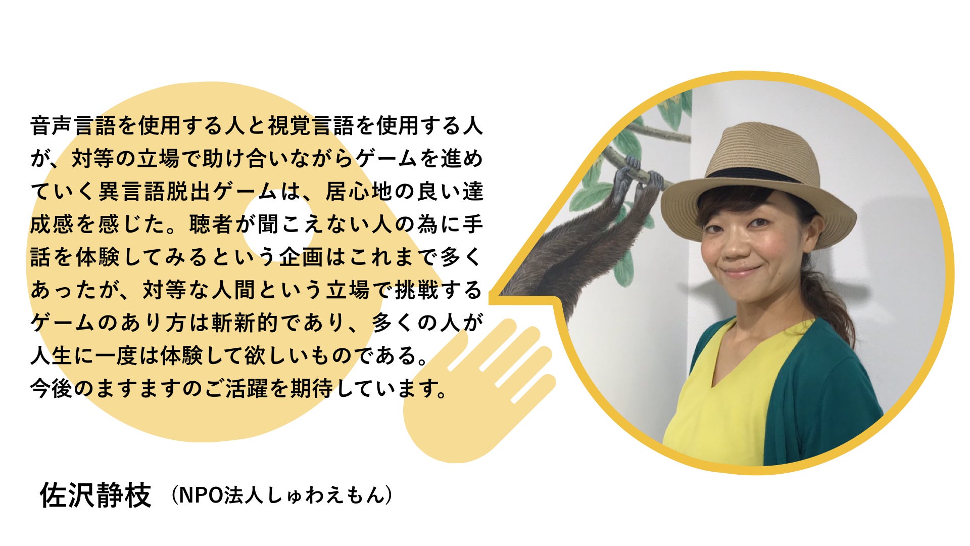【あと3日! 佐沢静枝さんより応援メッセージを頂きました!】佐沢静枝さんはろう・難聴のお子さんたち、その子たちに関わるすべての方たちが、お互いを尊重し合えるようにデフ・メロウ・キャンプや絵本読み聞かせなどの活動を展開した「しゅわえもん」を運営しています。 そんな彼女に異言語脱出ゲーム「5ミリの恋物語」を体験いただき、その時の体感を含めたご応援メッセージを頂きました。****************************************音声言語を使用する人と視覚言語を使用する人が、対等の立場で助け合いながらゲームを進めていく異言語脱出ゲームは、居心地の良い達成感を感じた。聴者が聞こえない人の為に手話を体験してみるという企画はこれまで多くあったが、対等な人間という立場で挑戦するゲームのあり方は斬新的であり、多くの人が人生に一度は体験して欲しいものである。今後のますますのご活躍を期待しています。 佐沢静枝 (NPO法人しゅわえもん) ****************************************異言語Lab.は2020年に向けて異言語脱出ゲームを定期的に開催し、多くの皆様に体験していただきたく、クラウドファンディングに挑戦しております。あと3日です、どうかどうか少額でも構いませんので、応援頂けますと非常にうれしいです。https://camp-fire.jp/projects/view/201002 引き続き応援のほど、よろしくお願いいたします。