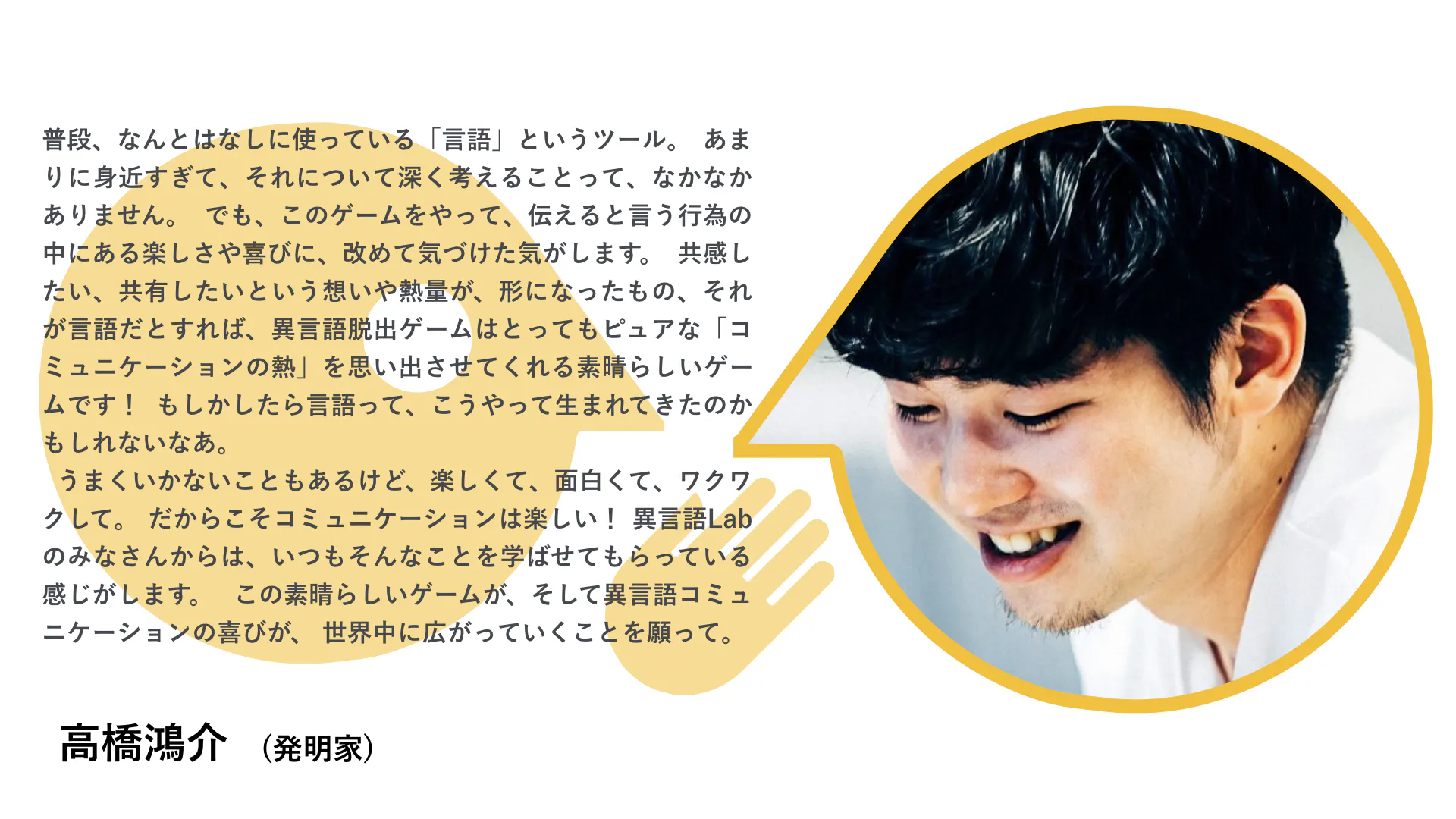 うまくいかないこともあるけど、楽しくて、面白くて、ワクワクして。 だからこそコミュニケーションは楽しい! 異言語Lab.のみなさんからは、いつもそんなことを学ばせてもらっている感じがします。 この素晴らしいゲームが、そして異言語コミュニケーションの喜びが、 世界中に広がっていくことを願って。