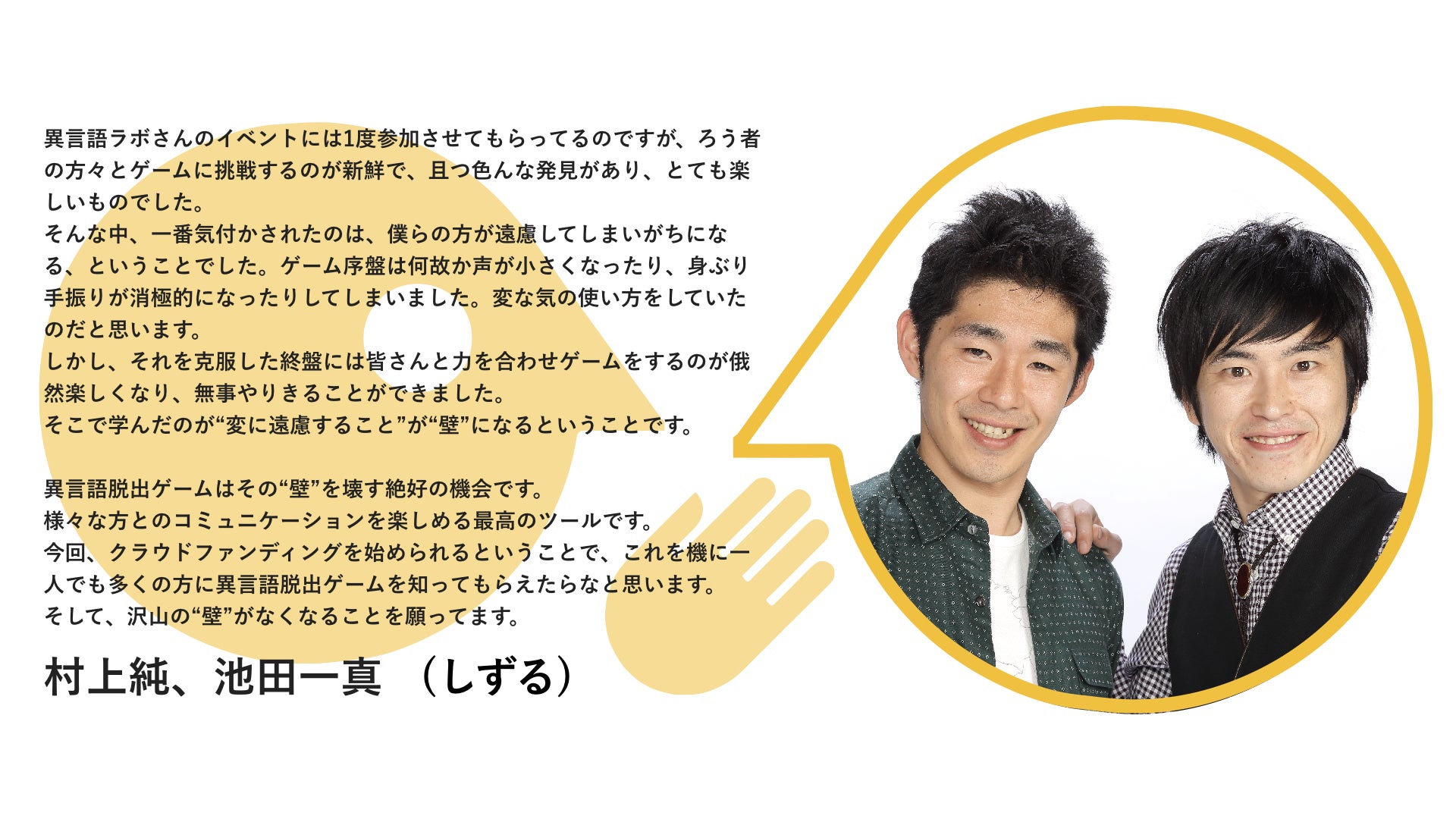 今回、クラウドファンディングを始められるということで、これを機に一人でも多くの方に異言語脱出ゲームを知ってもらえたらなと思います。
