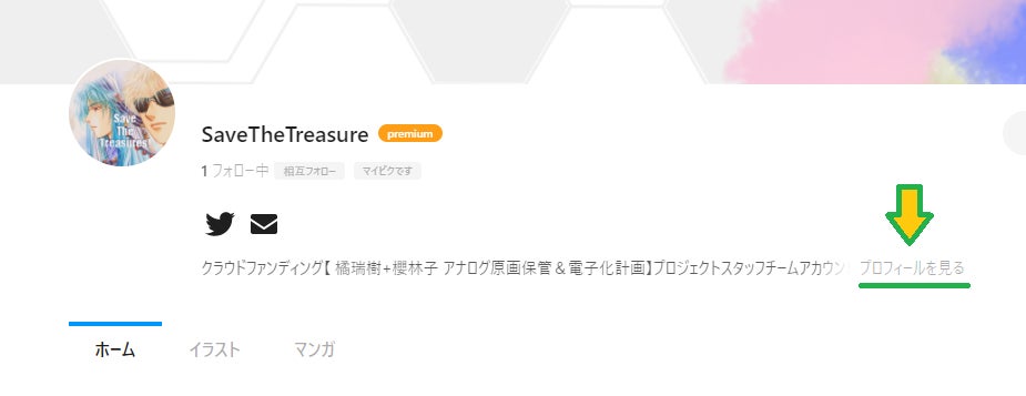 ※ページ数のカウントはpixivのTOPにあるプロフィール(下図参照)で公開しております。 作品掲載の更新時にカウントも更新していきますので、ご確認下さいますようお願いします。