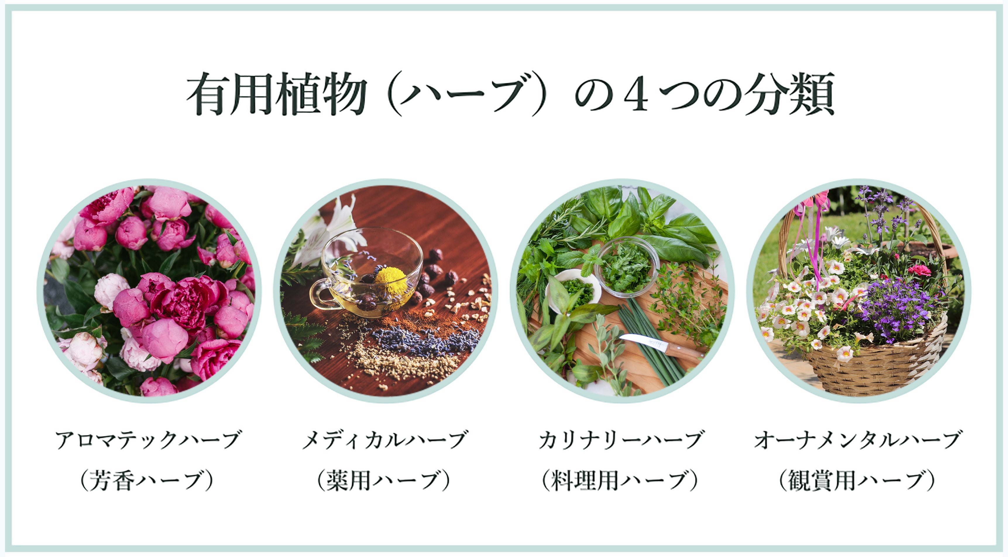 ハーブの品種は1万種類以上あると言われています。そのためハーブの特徴と用途に合わせて、4つの分類に分けられています。