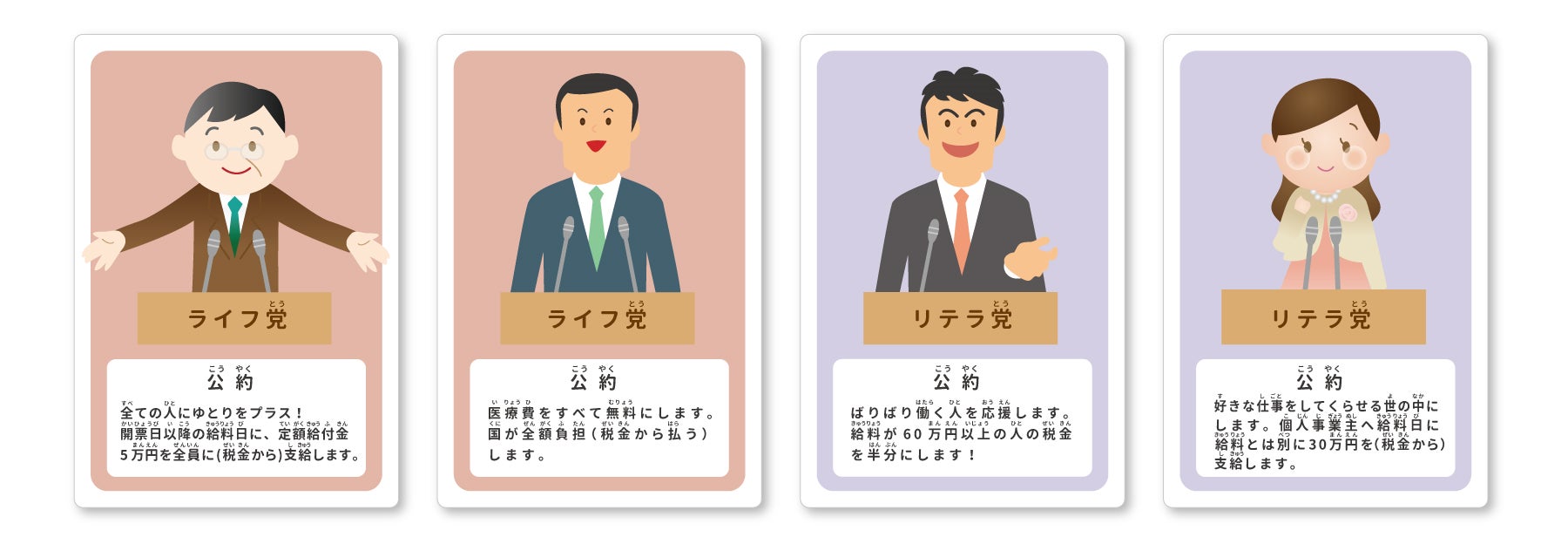 ⑥最初のプレイヤーが「内閣総辞職、突然の解散総選挙」マスに来たら、立候補者を各党から一人ずつ選び立候補者マスに置く。さらに全員に投票券を配る