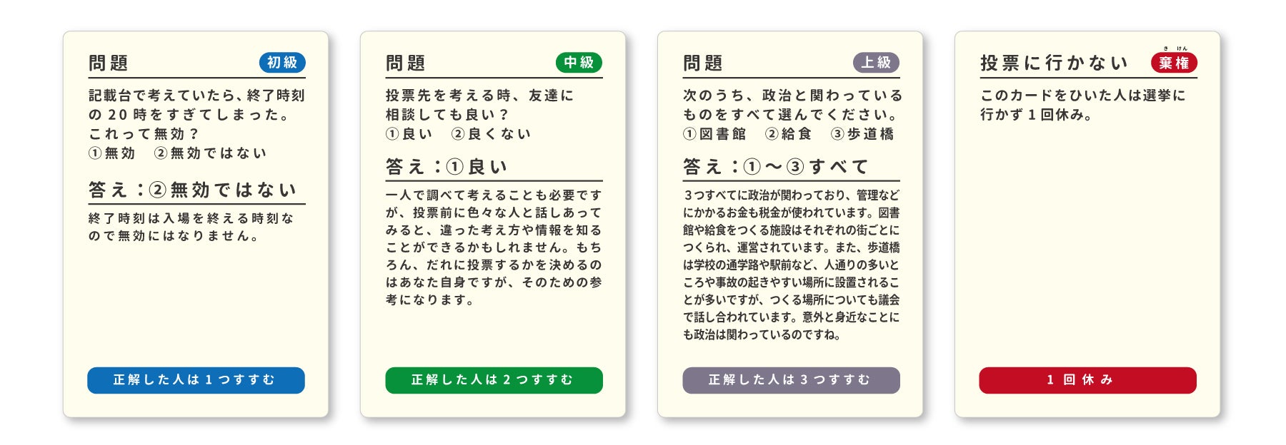 ⑤「選挙クイズに挑戦」マスに止まったら、カードを引きクイズに答える。正解したらカードの指示通りに進む。