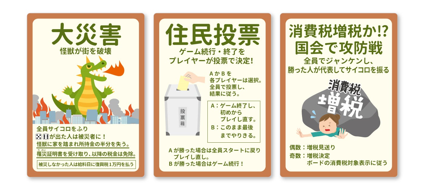 途中プレイヤー全員が参加して行われる選挙の結果でルールが変更したり、怪獣出現による大災害で復興税が加算されるなど、社会の縮図が再現されたボードを進み、遊びながら社会保障や税、選挙について学びます。