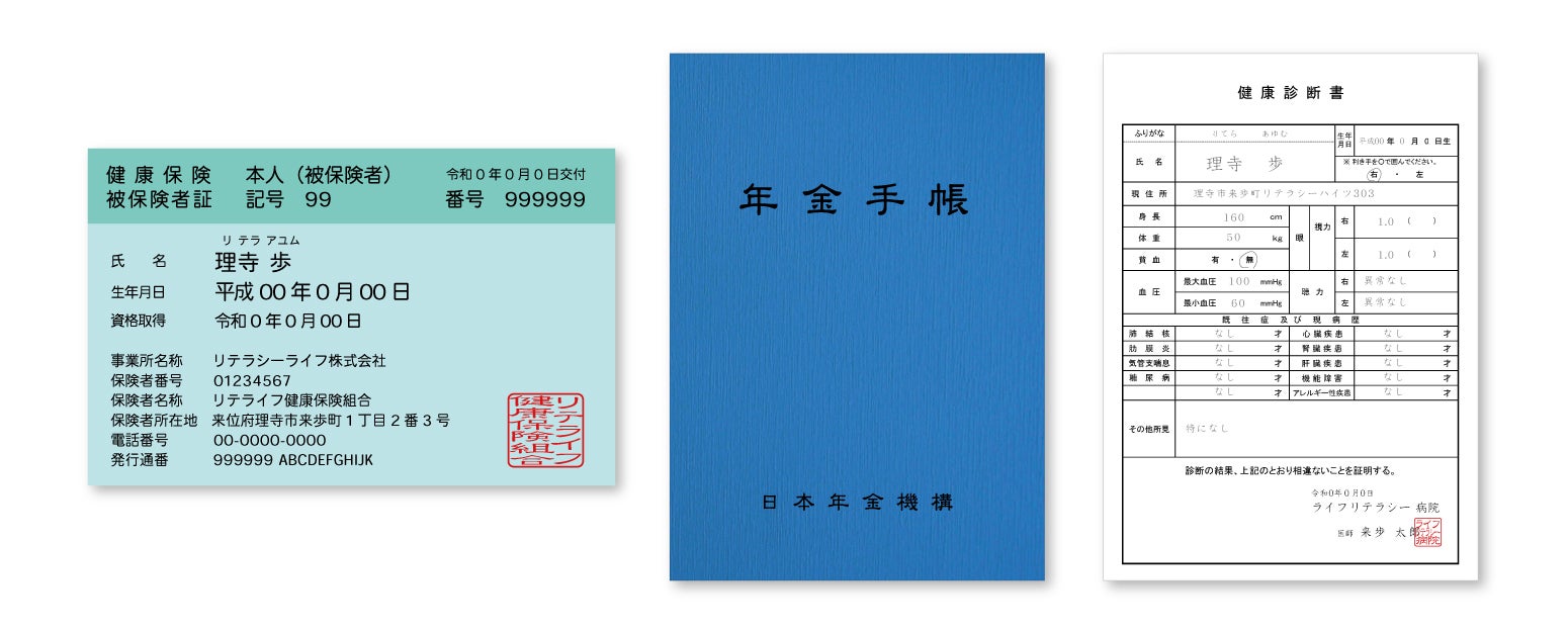 ➀各プレイヤーはコマを選び、年金手帳と健康保険証を1枚ずつ取る。職業カードを引いて職業を決める。