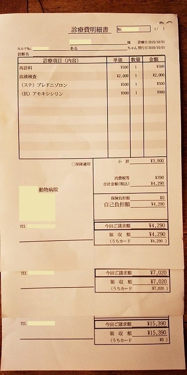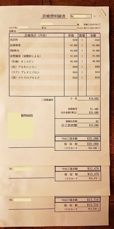 明細書はスペースを取るので重ねた状態で申し訳ありません。一番上の日付が9/17になっておりますが、治療開始は9/10に間違いなく、下に重ねてあります。この内、ブロードライン(駆虫薬)代1,836円(当時の税8%込)を引いて、118,719円です。他は全て治療費に相違ありません。