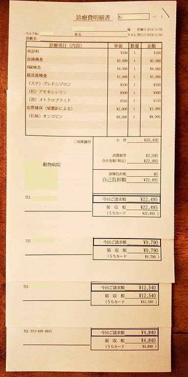 抗がん剤治療、血液検査・X線撮影(エコー検査が加わることも有)、ステロイド・抗炎症剤の飲み薬に加え、副作用その他の症状の治療費が獣医師さんのお話では1か月約5~6万円超(最低でも5万円)かかるとのことです。