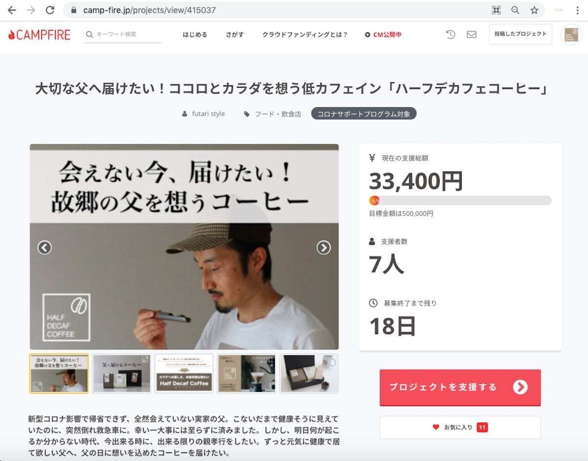 2021/06/07 19:12いつもお世話になっております。先般新たに募集しておりましたプロジェクト「大切な父へ届けたい!ココロとカラダを想う低カフェイン Half Decaf Coffee 父の日に贈るコーヒーギフト」https://camp-fire.jp/projects/view/415037の受付が本日最終日となりました。しかしながら、私の努力至らぬところもあり、目標までは非常に厳しい状態です><リターンの商品製造とお届けに向けては、プロジェクト主旨の通り、「会えない今、どうしても今届けたい!」そんな想いが強く、たとえ赤字になろうとも、着々と準備進めております。(ALL-in方式ですので、目標額達成しない場合でも、プロジェクトは成立&実行されます。)募集は、今夜23時59分で締め切りとなります。最後まで頑張ってまいりますので、皆さま、どうぞ応援よろしくお願いします!!https://camp-fire.jp/projects/view/415037Half Decaf Coffee竹内 もっと見る