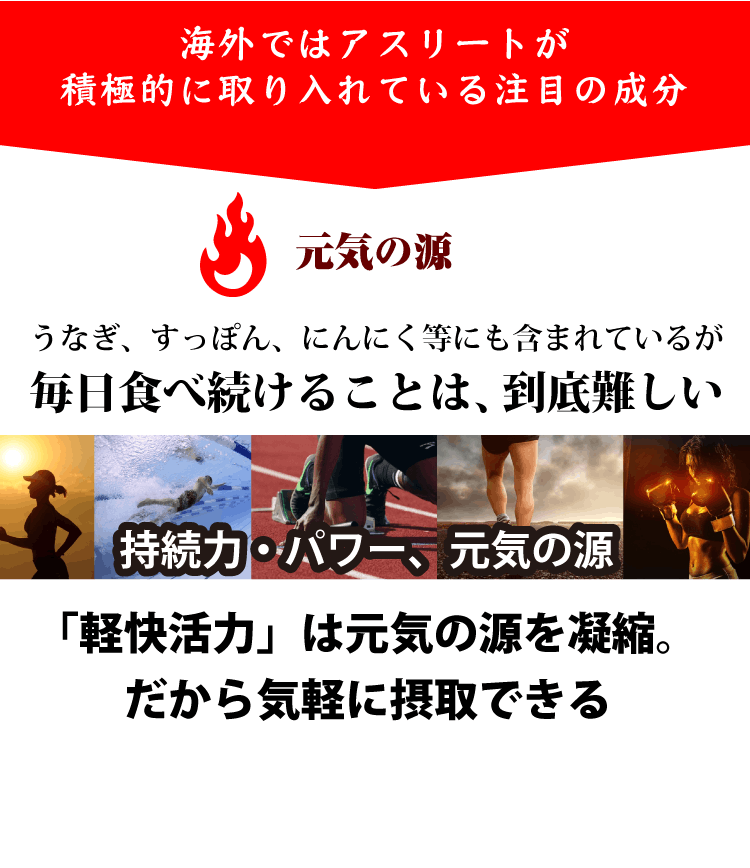そして、この度は疲れによる悩みをサポートして毎日元気でいたい方へのサプリメント「軽快活力」の開発を考えております。