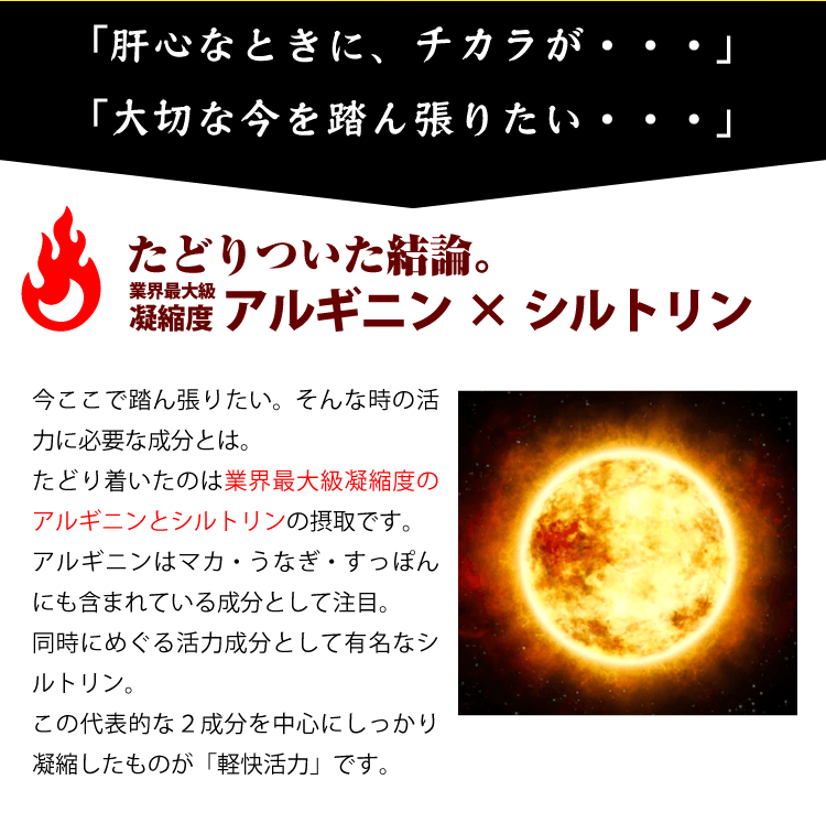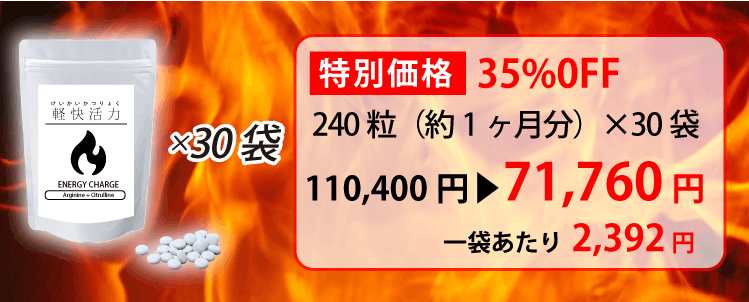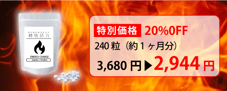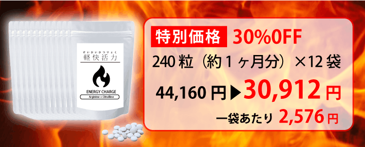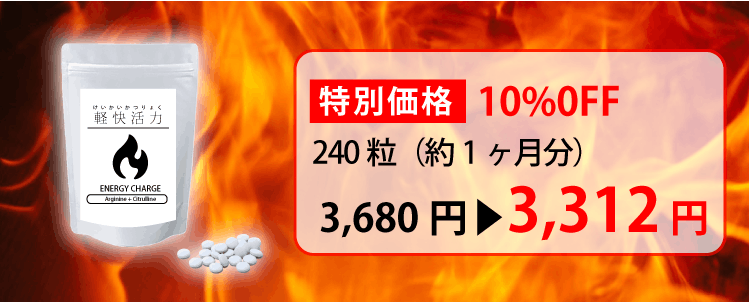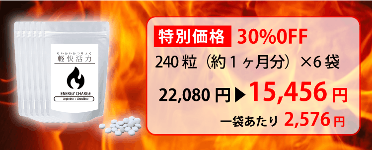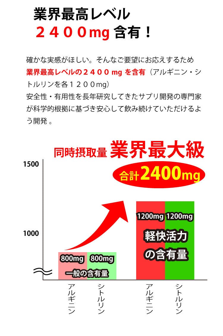 アルギニン・シトルリンのサプリは、若々しく健康でいられるための1つの鍵です。多くの方が日本最大級の含有量である「軽快活力」を適正な価格で手に入れられるよう、どうかご支援をお願いいたします。