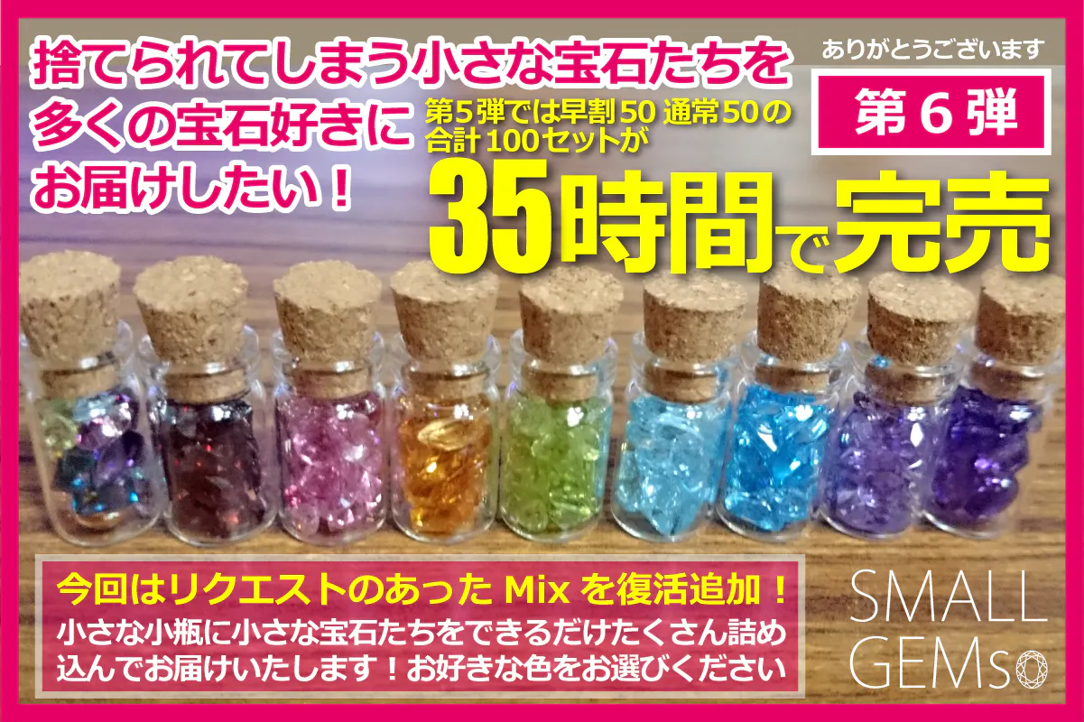 今回は、第5弾プロジェクトで早割50セットが18時間、通常50セットが17時間、合計100セットが35時間で完売となった色別の「小さな宝石たち」に加えて、リクエストのあったMixを復活追加してお届けさせていただきたいと願っております。