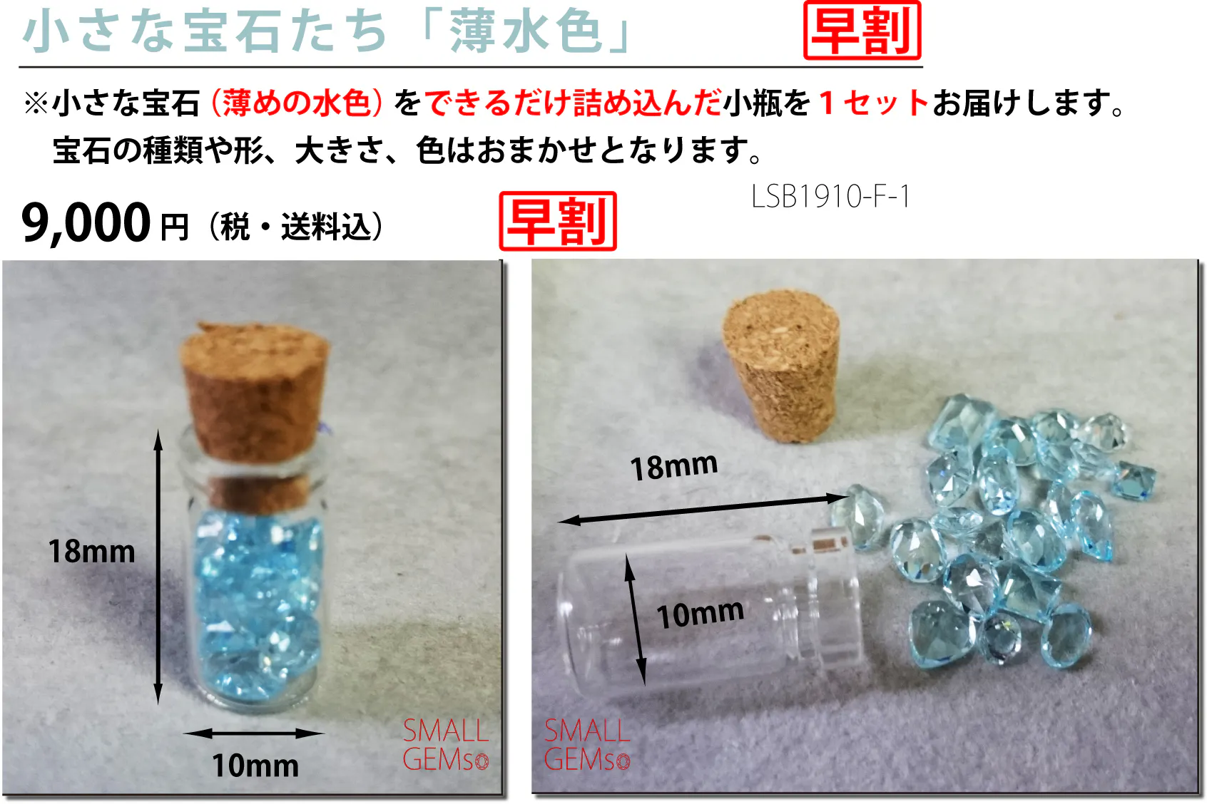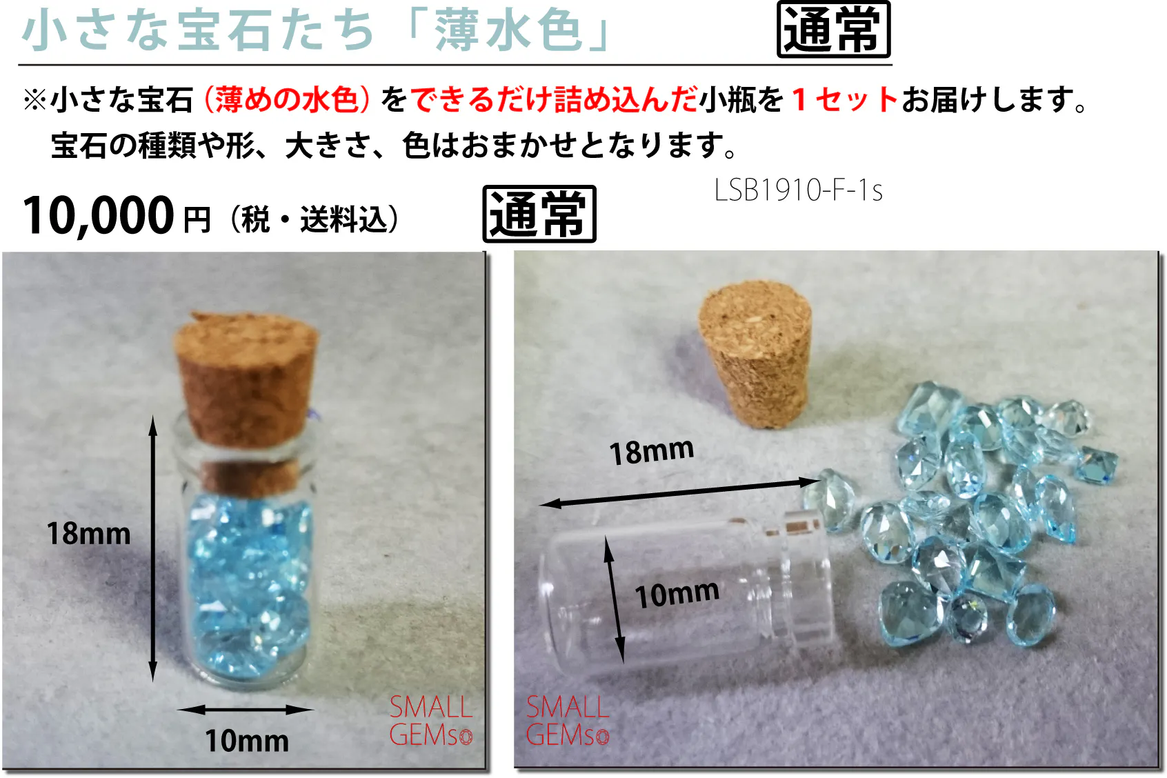 小瓶に詰め込む宝石それぞれの形や大きさによって、中に入っている小さな宝石たちの「数」はそれぞれの商品ごとに異なりますのでご了承ください。