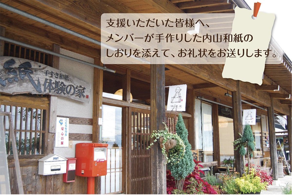 木島平村の内山手すき和紙体験の家さんにご協力いただき、メンバーみんなで手すき和紙のしおりをつくり、お礼状に添えて提供いたします。