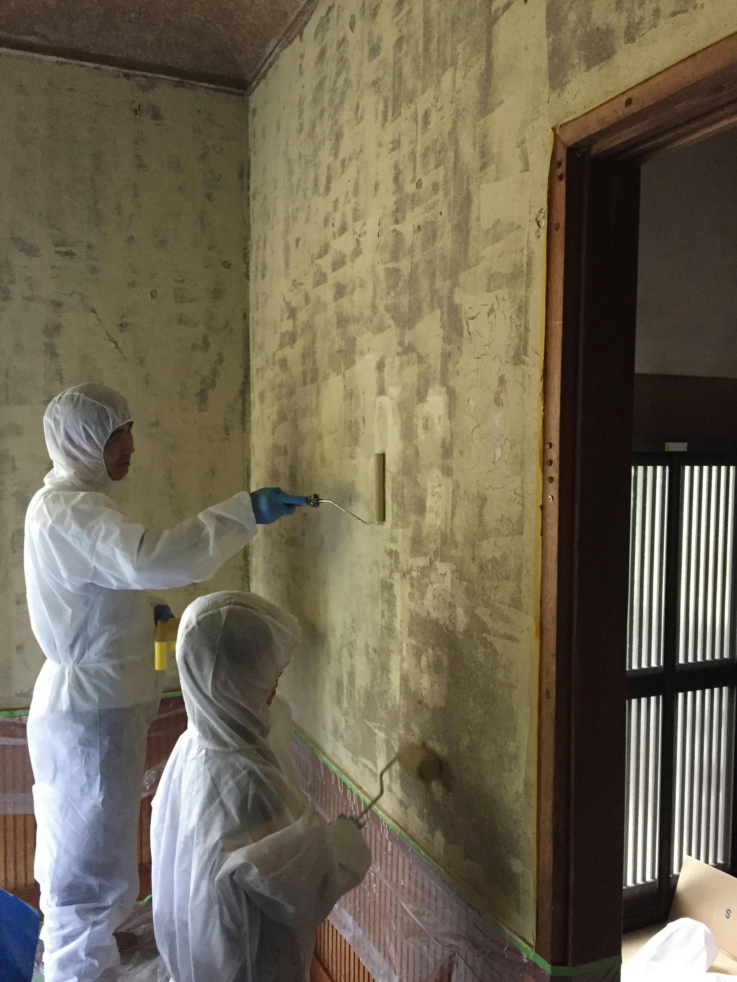 写真は、画家さんのアトリエだった部屋を、カフェスペースにするため、壁塗りをしているところ。
