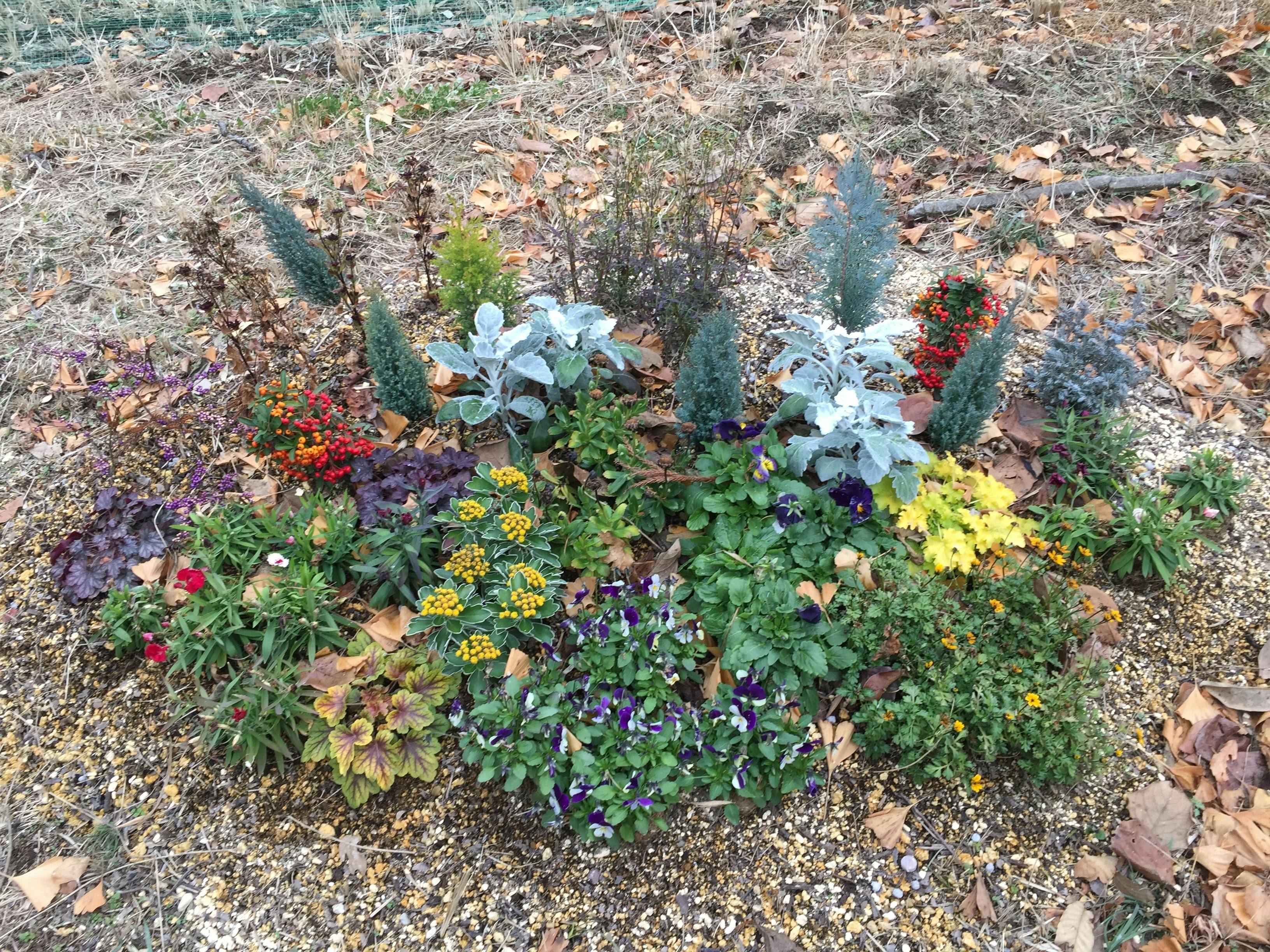 具体的に、中央の花壇は、一般園芸、山野草、ハーブのコーナーをそれぞれ作り、その間にブルーベリーなどの果樹や、モッコウバラ、花桃、牡丹、ルビー山査子、スノーボールなどの苗木を、そして一番中央にはシンボルツリーとなるコニファーを植える予定です。庭の北側の一角には、スペルト小麦のコーナーを作ります。