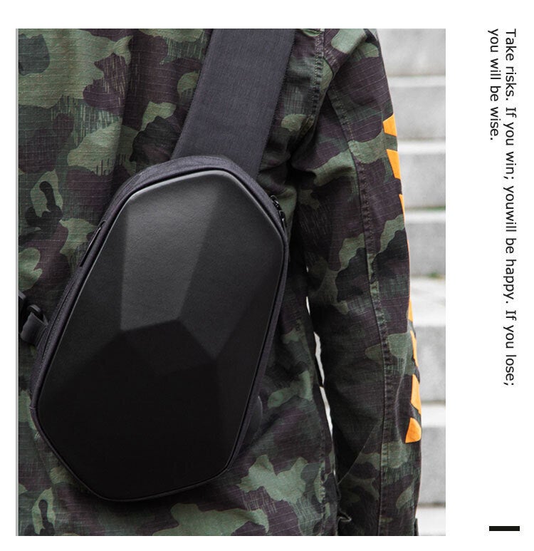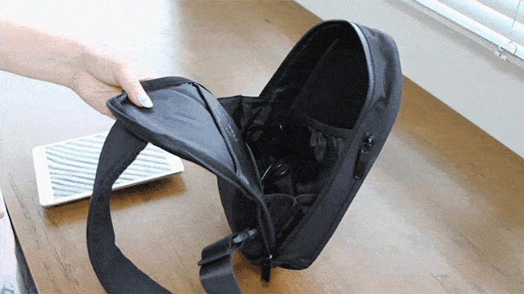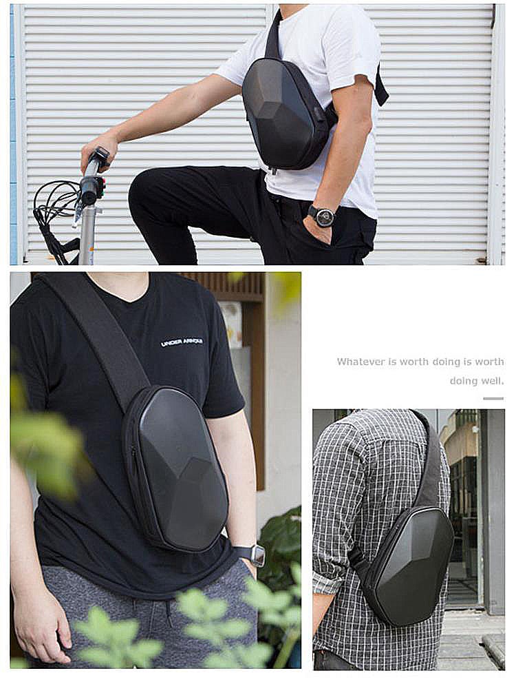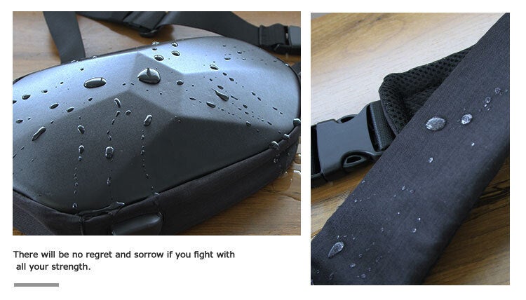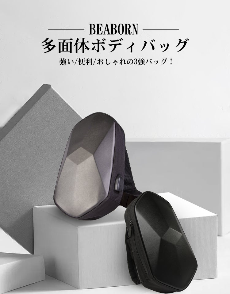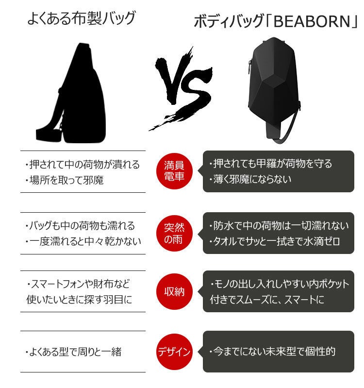 多面型ボディバッグ「BEABORN」は、特殊素材で頑丈・布バックのように潰れもしません。満員電車や雨からシッカリあなたの荷物を守ります。