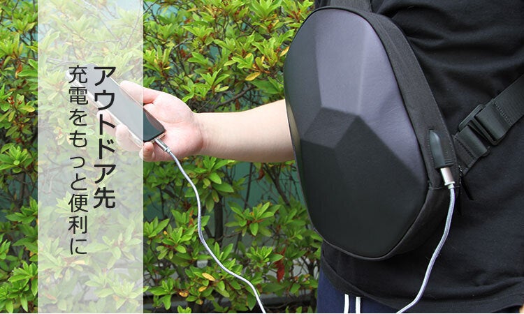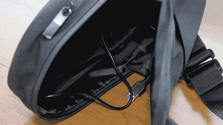 バッグ内にUSBポートとモバイルバッテリーを繫げることができるケーブルが付属しているので、モバイルバッテリーを接続していればスマートな充電が可能!