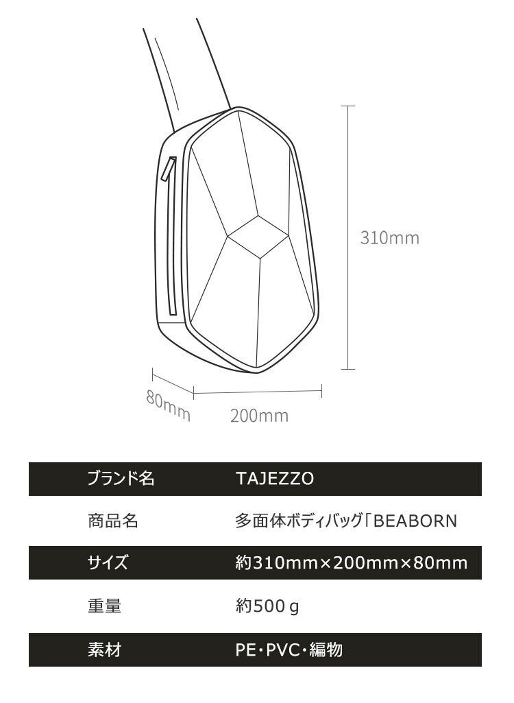 機能性や利便性だけではなくデザイン性も兼ね備えた、「幾何学的」で「薄い」今までのバッグの常識を覆すまったく新しい多面型。