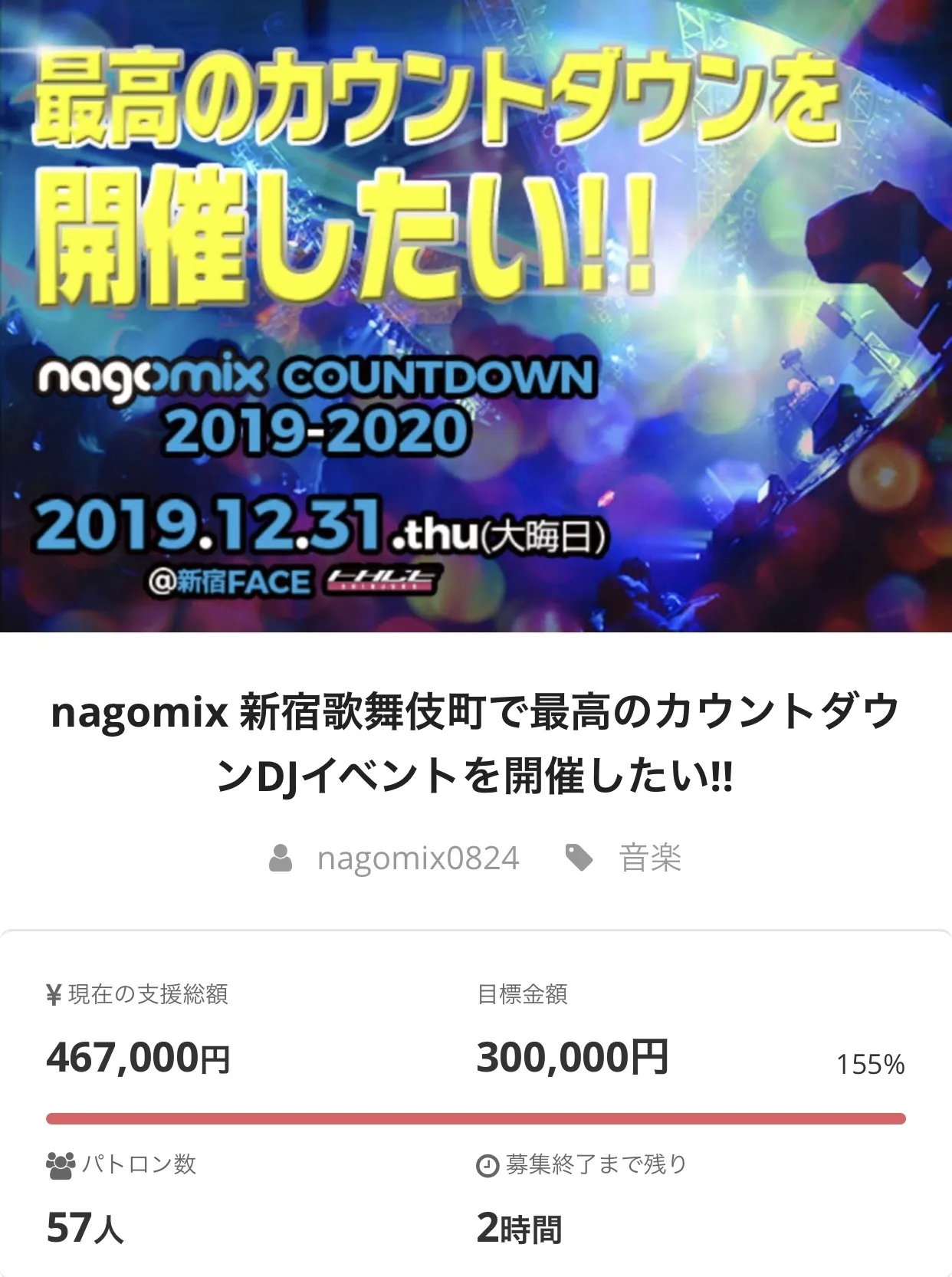 そして本年大晦日の12月31日に新宿歌舞伎町にある会場「新宿FACE」にて「nagomix COUNTDOWN 2019-2020」を開催させて頂くにあたり、クラウドファウンディングでご支援を募り、お客様により楽しんで頂けるイベントの開催を目指します。