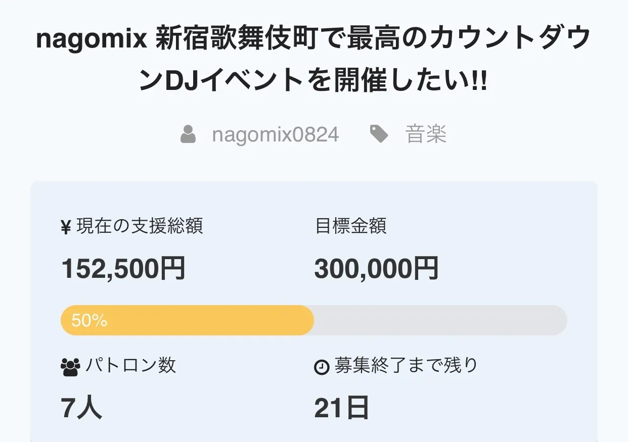 クラウドファンディング2日目で50%達成!! 有難うございます!! 最高のカウントダウンDJイベントになるよう引き続き頑張ります! 皆様の温かいご支援お待ちしております!