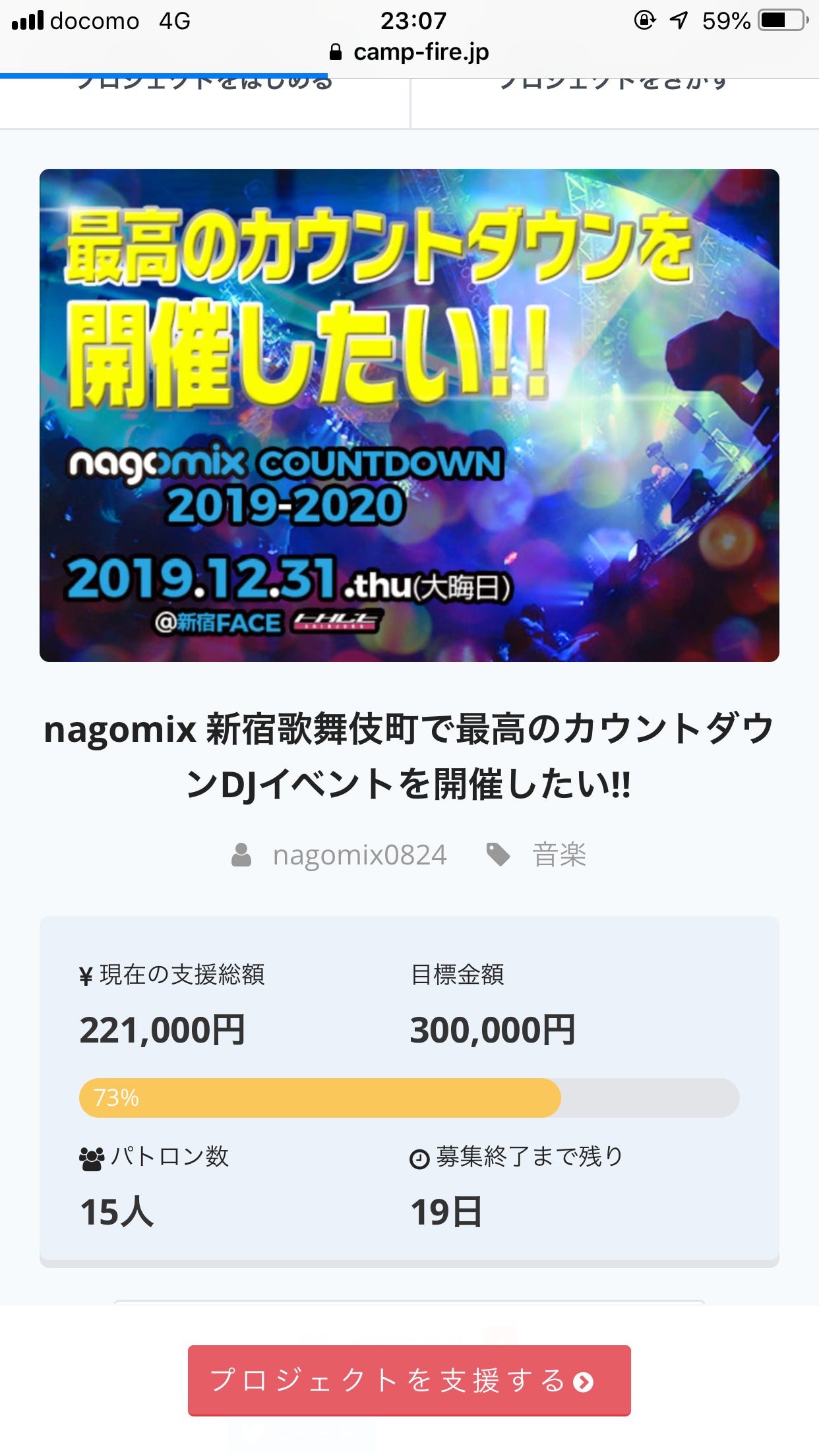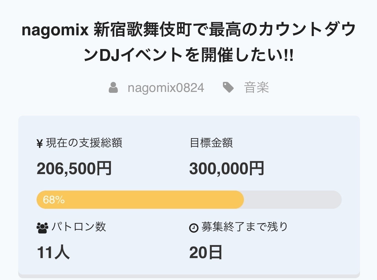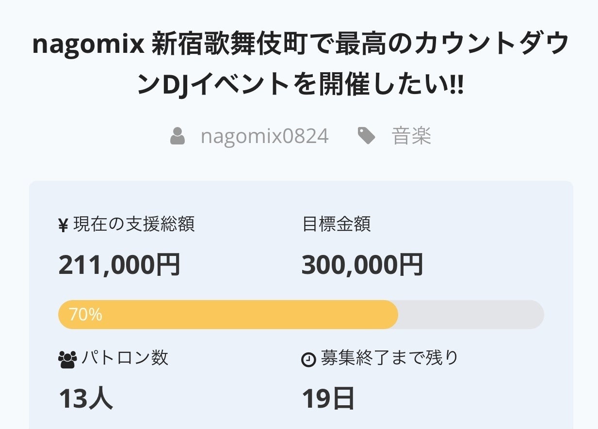 クラウドファンディング2日目で50%達成!! 有難うございます!! 最高のカウントダウンDJイベントになるよう引き続き頑張ります! 皆様の温かいご支援お待ちしております!
