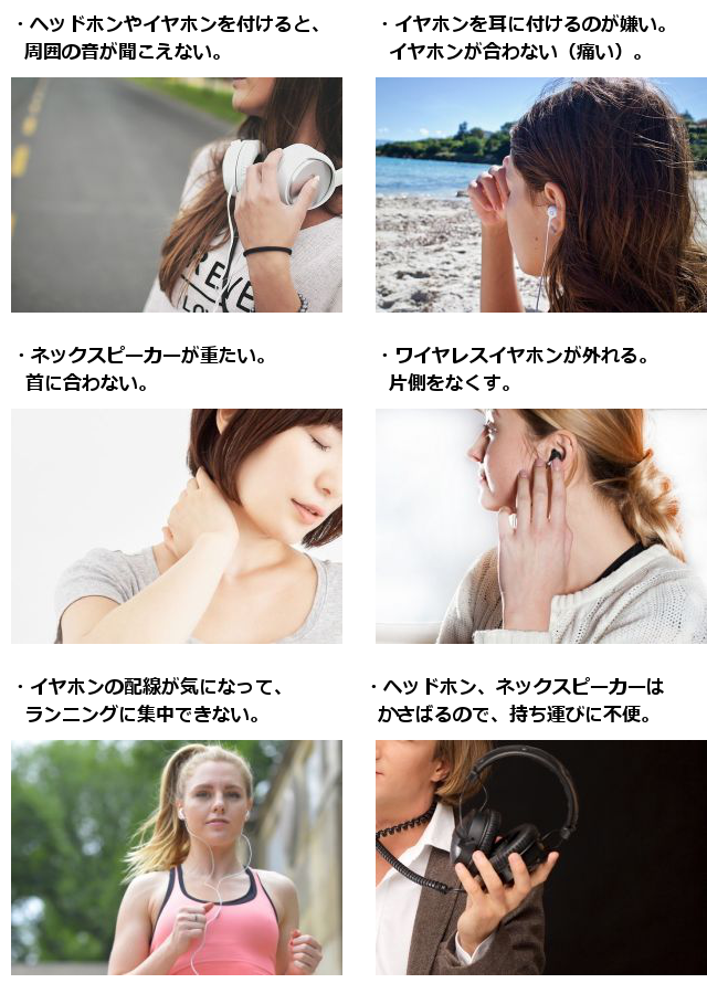 イヤホンの嫌悪感、ヘッドホンの閉塞感。従来型ネックスピーカーのズレやサイズの違和感。