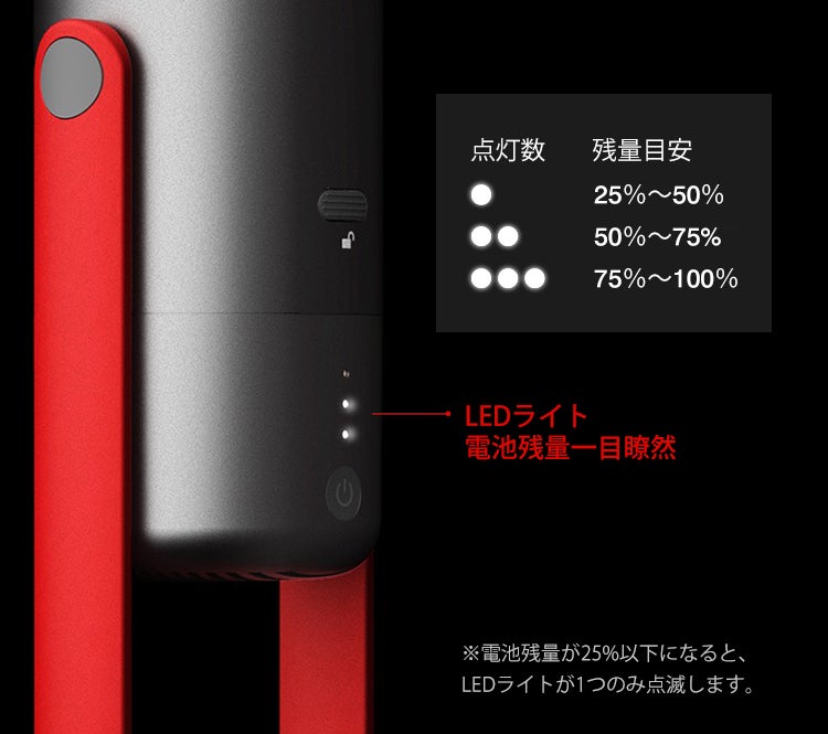 2200mAhの高性能リチウム電池搭載、3段階LEDライト表示で電池の残量は一目見れば分かります。