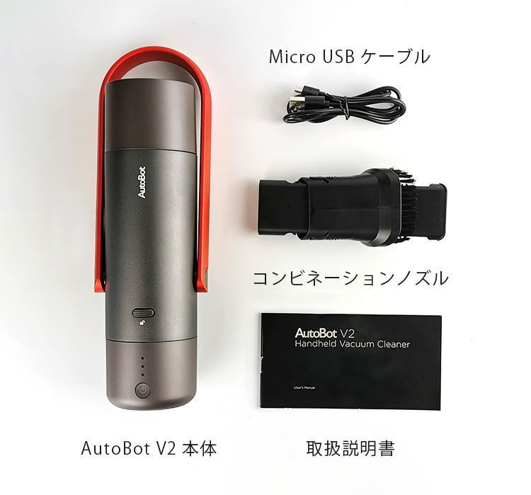 1セットにつき、掃除機本体1個、2in1のコンビネーションノズル1個、Micro USBケーブル1本、取扱説明書1冊となります。