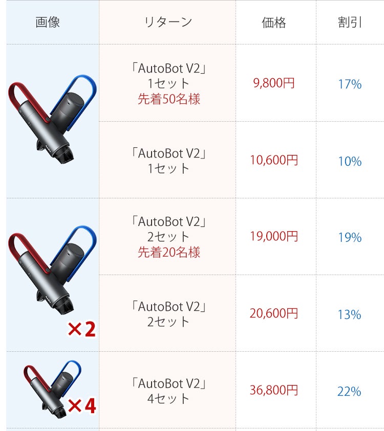 2020/01/06 15:39ご支援いただいた皆さま、こんにちは。雲集商事株式会社でございますこの度、28cmの小型ボディで進化したコードレス掃除機「AutoBot V2」第二弾!をご支援頂き、ありがとうございます。本プロジェクトリターン商品の発送は予定通り、今週中に皆様宛に行いますが『住所記載ミス』や『引っ越し』等で、商品戻りが発生しております。円滑の商品をお届けさせて頂きたいので今一度、配送先の住所確認のご協力をお願いします。お申し込み時にご指定いただいた配送先は、マイページよりご確認いただけます。変更があった場合は、マイページより住所変更の手続きをお願いします。今後ともをよろしくお願いいたします。 もっと見る【御礼】プロジェクト終了!と住所確認。
