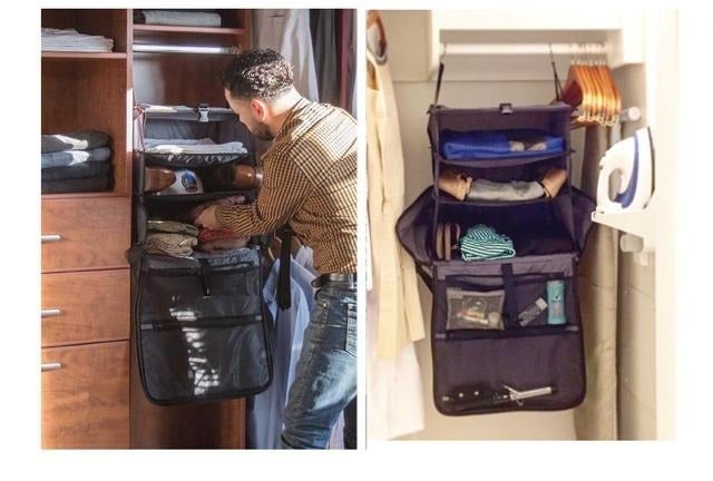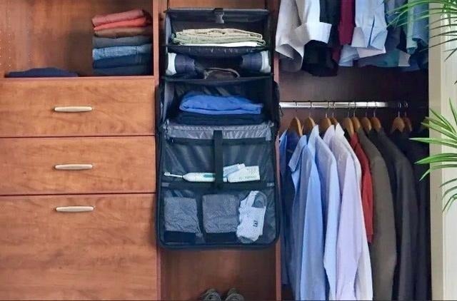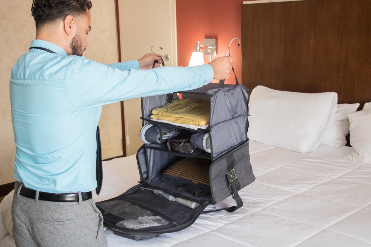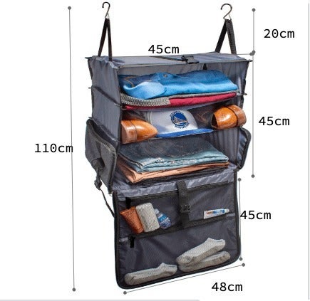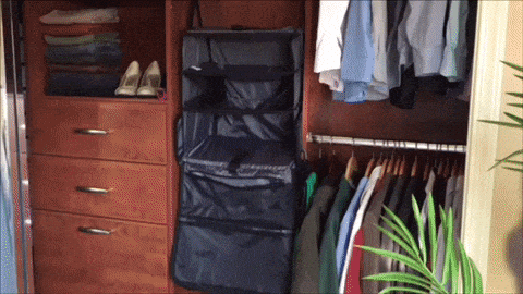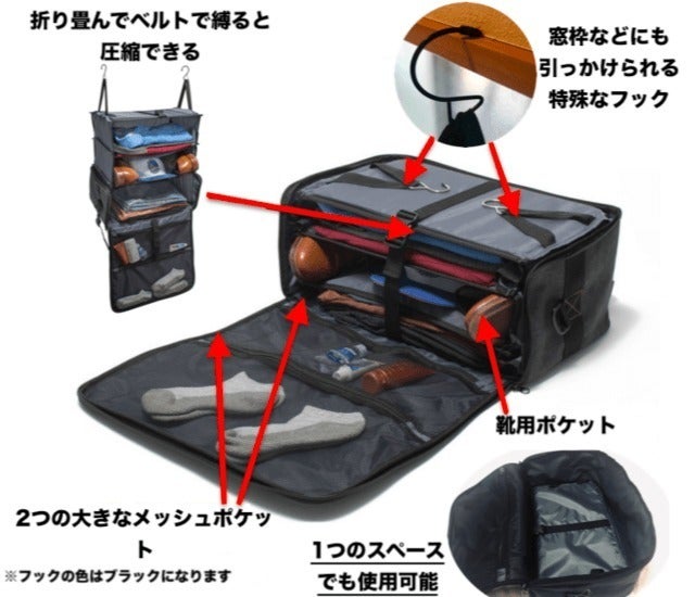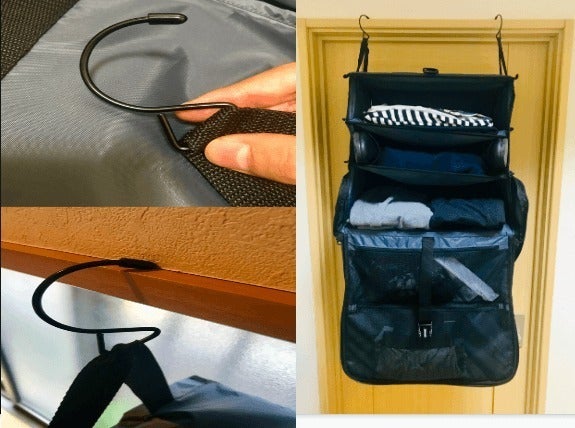 ホテルに着いたら開いて引っかけるだけ! あっという間に自宅のクローゼットを再現できますよ。荷物がグチャグチャになっていたり物を探す必要がありません。