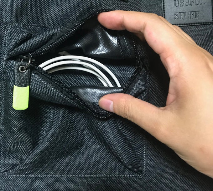 小物用ポケットは2箇所あり、イヤホンや充電器などの収納にも最適。また裏地は防水加工をしているため安心です。