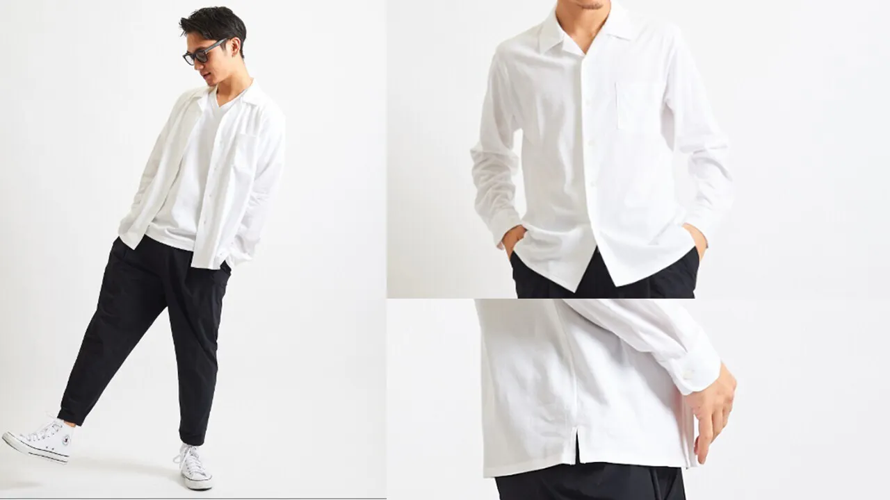 開襟シャツの襟元からインナーにしたVネックが見えない丁度いい組合わせ設定になっています。この組み合わせを持っていればコーディネートが増え、快適生活の幅が拡がりますね。