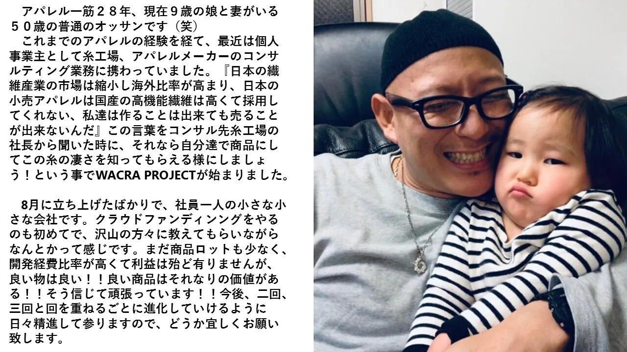 これを機に、応援していただける皆様と共に、国内及び世界に向けてた新たな市場を開拓し、日本繊維産業の活性化と、この WACRA PROJECT に関わる全ての方々の日常生活の質の向上を願い、ご挨拶の言葉と変えさせていただきます。