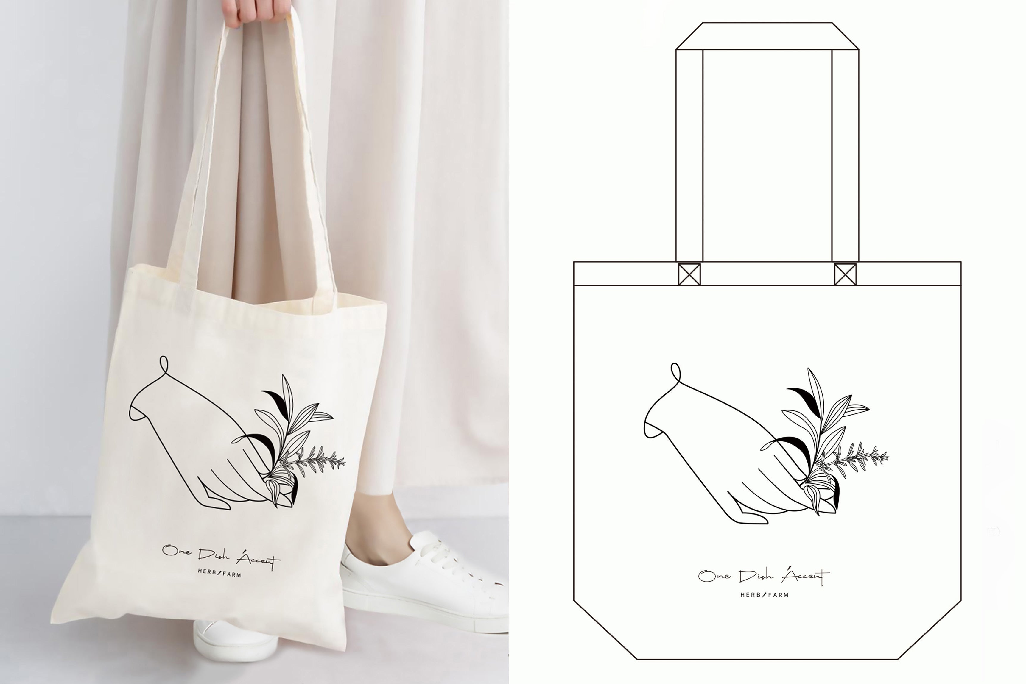 トートバックのイラストは手から手へと農園のハーブが渡って行けば良いなという思いから、私がもっとも感動する収穫の日(harvest)をイメージしてイラストを描きました。