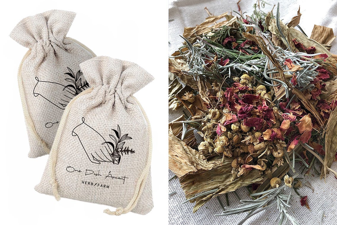 農園で採れた8種類のハーブのサシェには国内では珍しい、ターメリックリーフ、シナモンリーフ、ホワイトセージに加えラベンダー、ローズマリー、レモングラス、カモミール、ローズを乾燥させ細かく裁断しポーチに詰めています。枕元やクローゼットに入れて芳香剤としてお使い下さい。