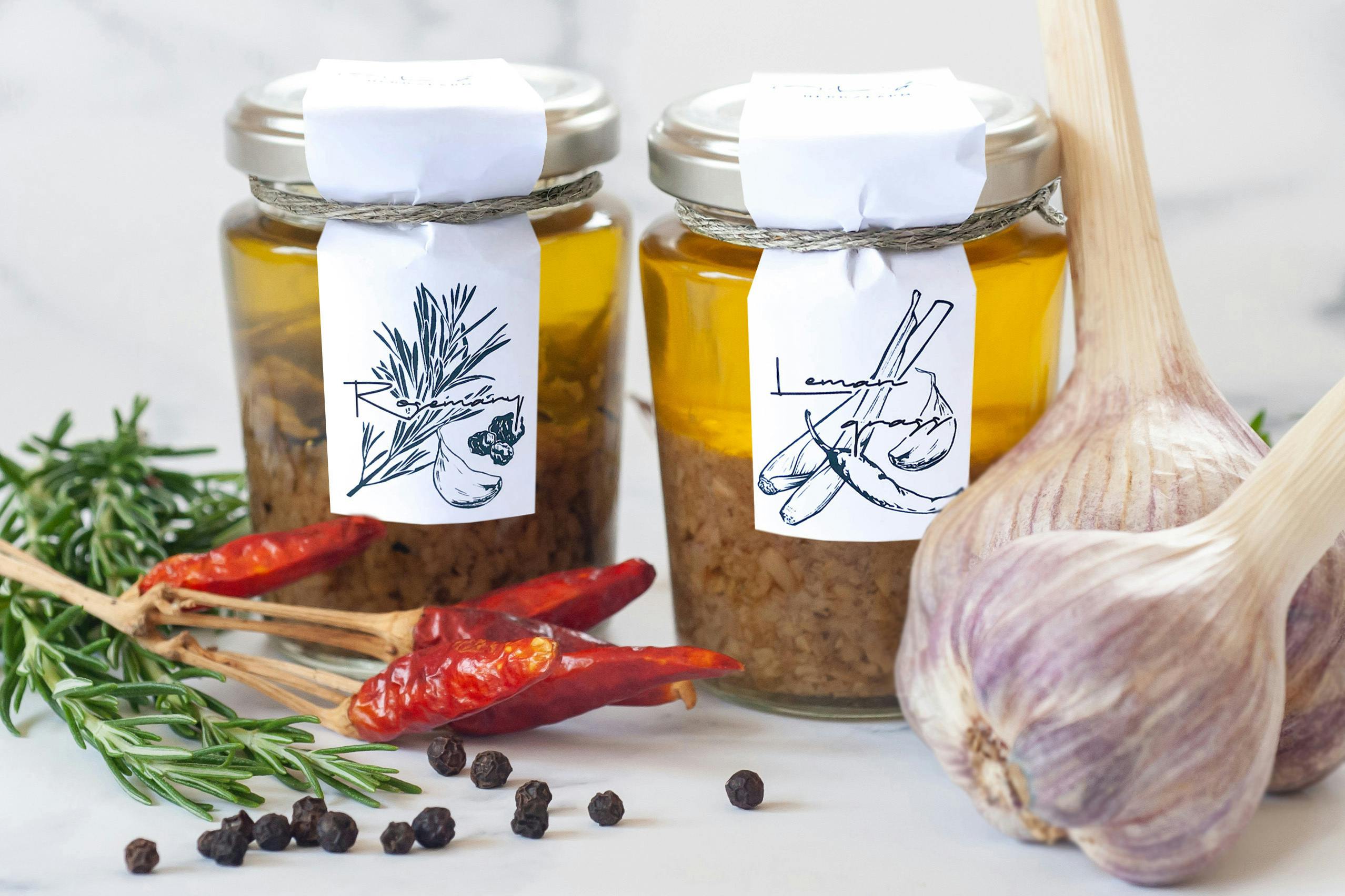 『ハーブガーリックオイル』は農園で採れたハーブと青森県産のホワイト六片を低温のオリーブオイルでじっくり加熱し、素材の香りと旨味を残した無添加のハーブガーリックオイルです。