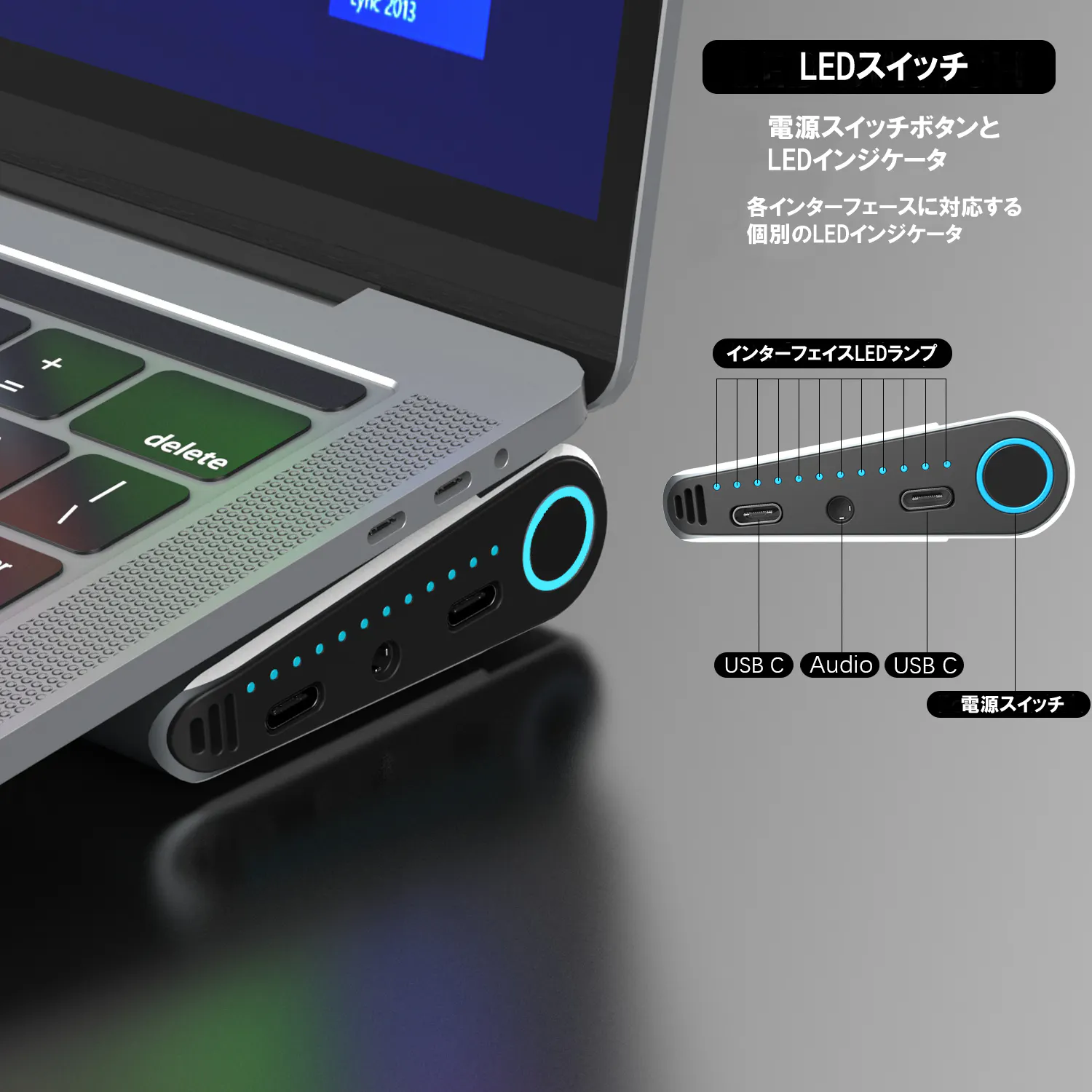 LEDインジケータ:各インターフェイスに対応する9個の個別LEDインジケータ