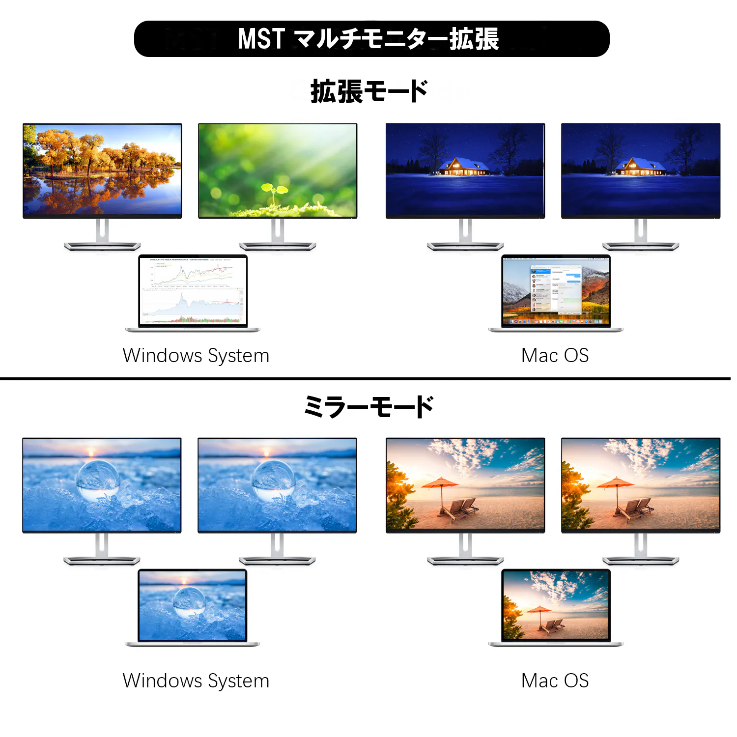 トリプルモニター拡張/ミラー:DP + VGA + HDMI(出力元からのミラーリング/拡張3モニター)