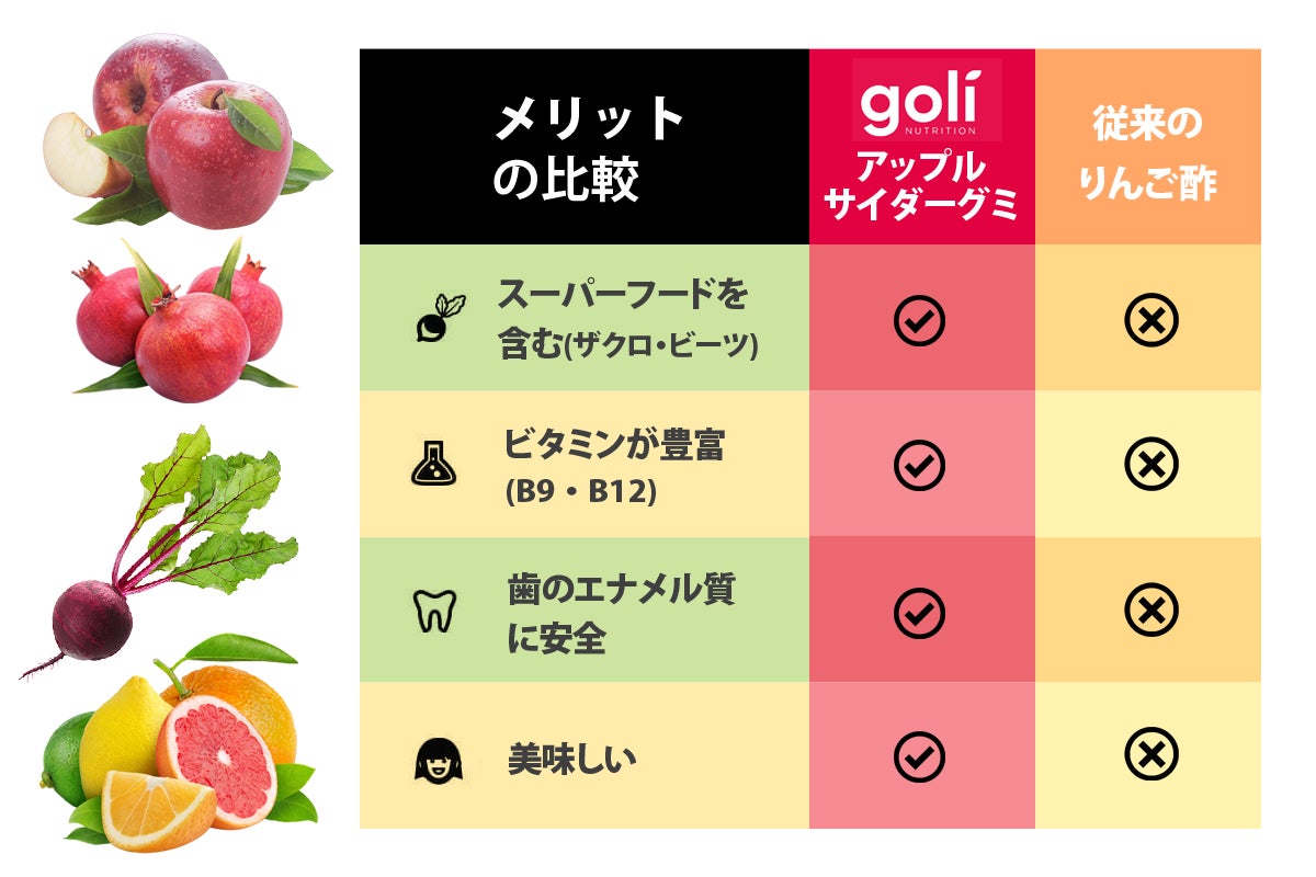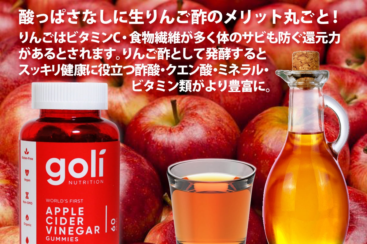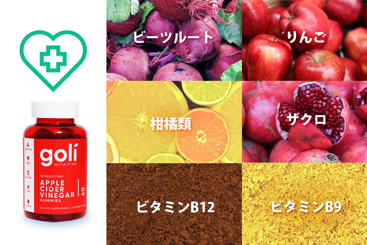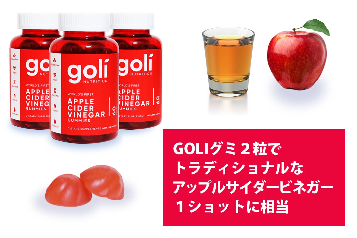 GoliはApple Cider Vinegar(ACV)の昔からの伝統的な利点を含むグミを開発しました。 Goli Gummyは 100%オーガニック、非GMO、ビーガン、コーシャ、グルテンを含まず、防腐剤、化学物質、人工成分を含みません。 Goli Gummyは、オーガニック、アレルゲンフリー、コーシャ認証を受けた最先端のCGMP施設で米国内にて製造されています。