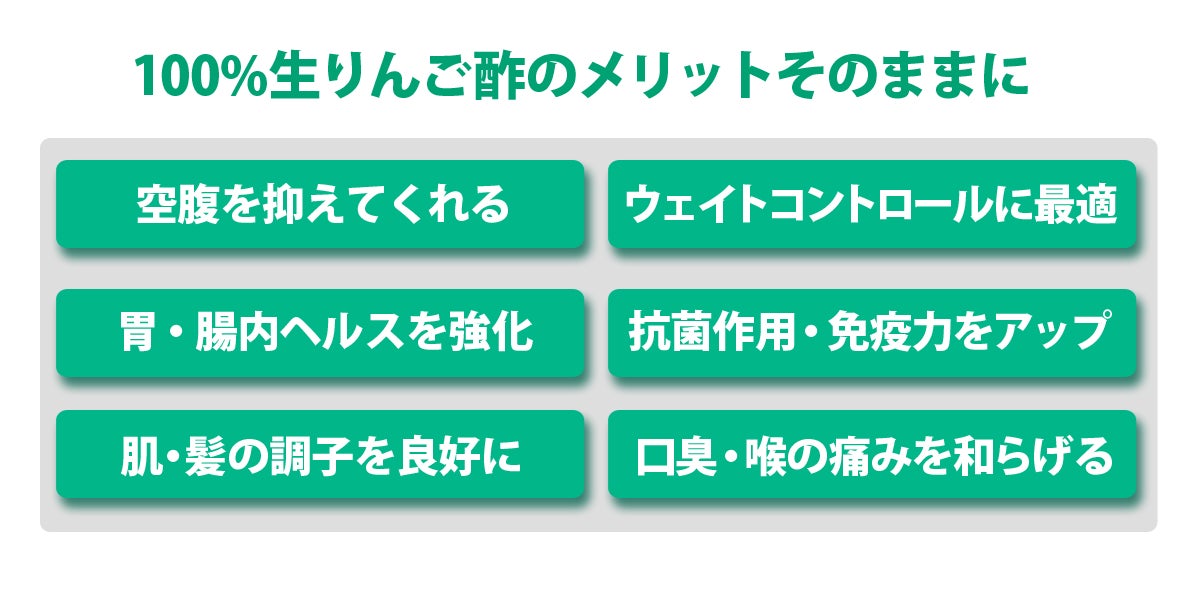 100%生リンゴ酢がもたらす健康上のメリットはそのままに、食べ辛かった「酸っぱさ」や「刺激の強さ」を完全にマスク。まったく新感覚のグミという形にして、健康成分すべてを包み込みました。