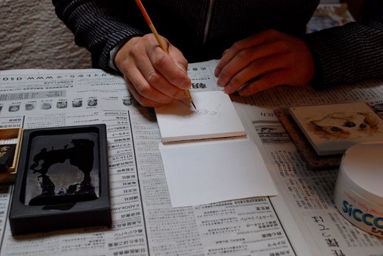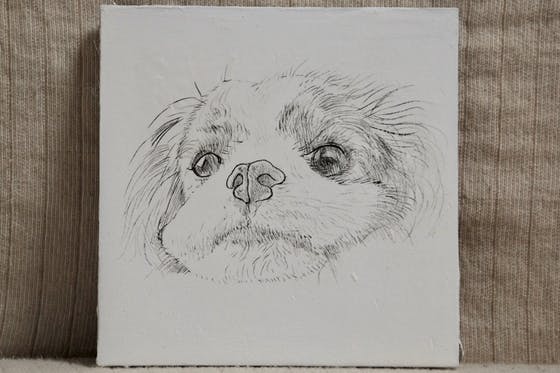 制作例です。 墨を使って油絵を描き始めたところです。 このような小さな絵で何ができるのか。それを考えながら、魂を込めて描いています。 by 告天子
