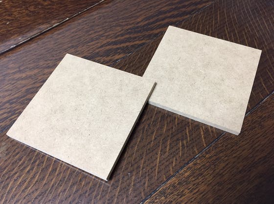 絵画作品の支持体として、厚さ6mmのMDF材を使用。10x10mmの大きさに加工しておく。